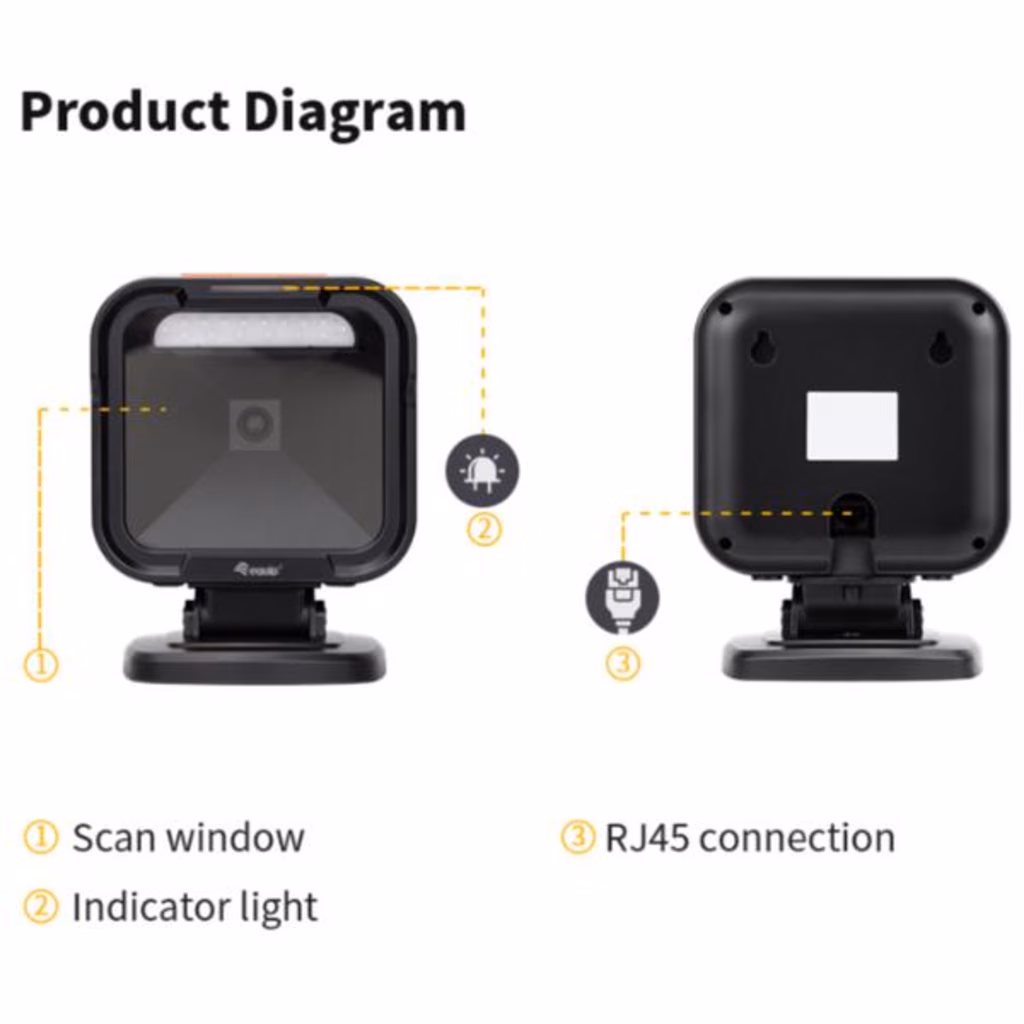 Il design da tavolo garantisce stabilità e facilità d'uso, consentendo la scansione a mani libere su un piano di lavoro o su una scrivania. Questo scanner è un'aggiunta preziosa per le aziende che desiderano snellire le operazioni, aumentare l'accuratezza e migliorare il servizio clienti. È uno strumento affidabile per le organizzazioni che cercano un modo efficiente per gestire le informazioni con codici a barre 2D in un ambiente desktop, con il vantaggio aggiuntivo di una fotocamera da 1MP per la scansione ad alta risoluzione.