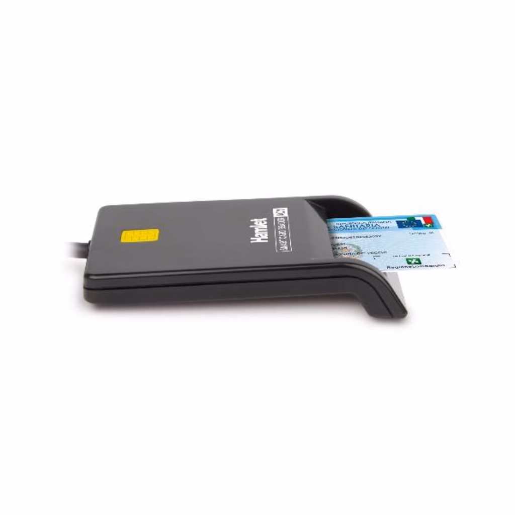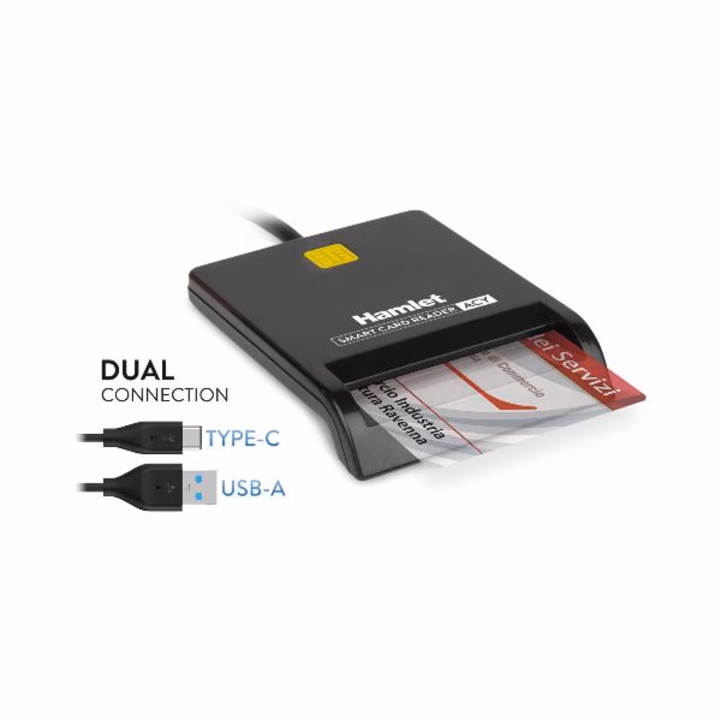 Hamlet HUSCR-ACY si collega al computer tramite cavo USB-C dotato di adattatore USB-A ed è compatibile con le specifiche ISO 7816, PC/SC 2.0 e USB-IF CCID. Certificazioni Microsoft WHQL e EMV.