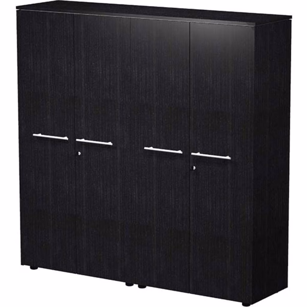 Composizione due armadi h158,2. Struttura colore grigio alluminio. Top, fianchi e ante in finitura (sp. 14 mm) colore nero venato. Top, base e fianchi sp. 18 mm. Ripiani regolabili in altezza sp. 25mm. Schiena sp. 10 mm. Piedini livellabili dall interno. Dimensioni L162,8 P43 H158,2. Finitura nero venato