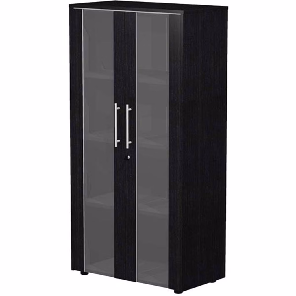 Armadio h158 con ante in vetro. Struttura colore grigio alluminio. Top e fianchi in finitura (sp. 14 mm) colore nero venato. Top, base e fianchi sp. 18 mm. Ripiani regolabili in altezza sp. 25mm. Schiena sp. 10 mm. Piedini livellabili dall interno. Dimensioni L82,8 P43 H158,2. Finitura nero venato