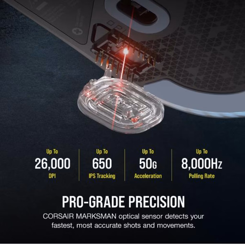 Il sensore ottico estremamente accurato CORSAIR MARKSMAN rileva ogni movimento con precisione millimetrica.