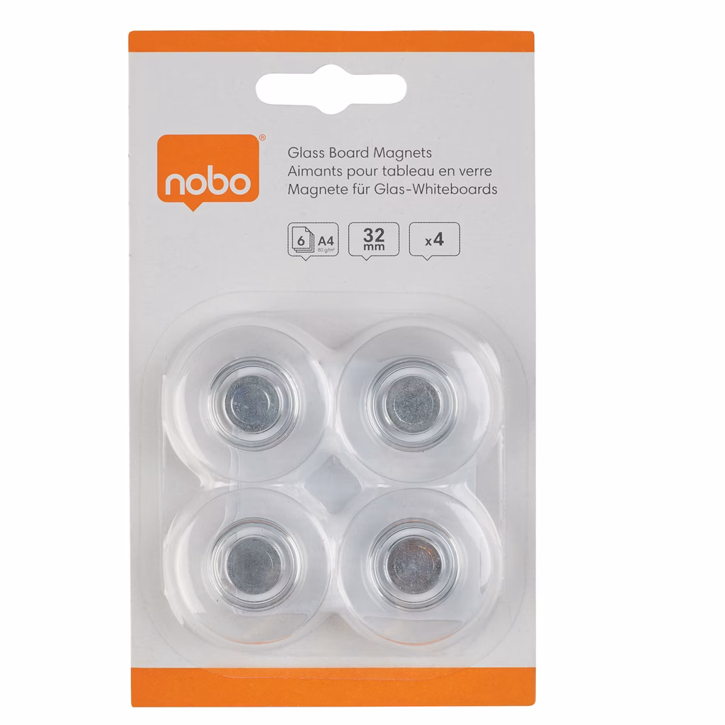 Magneti per lavagne bianche in vetro adatti a visualizzare e fissare promemoria o messaggi in modo ordinato e sicuro su una lavagna magnetica in vetro. Questi eleganti magneti rotondi trasparenti sono stati sviluppati specificamente per l'uso su superfici di vetro e possono contenere fino a 6 fogli A4 da 80 g/m². Diametro 32 mm, confezione da 4 magneti.