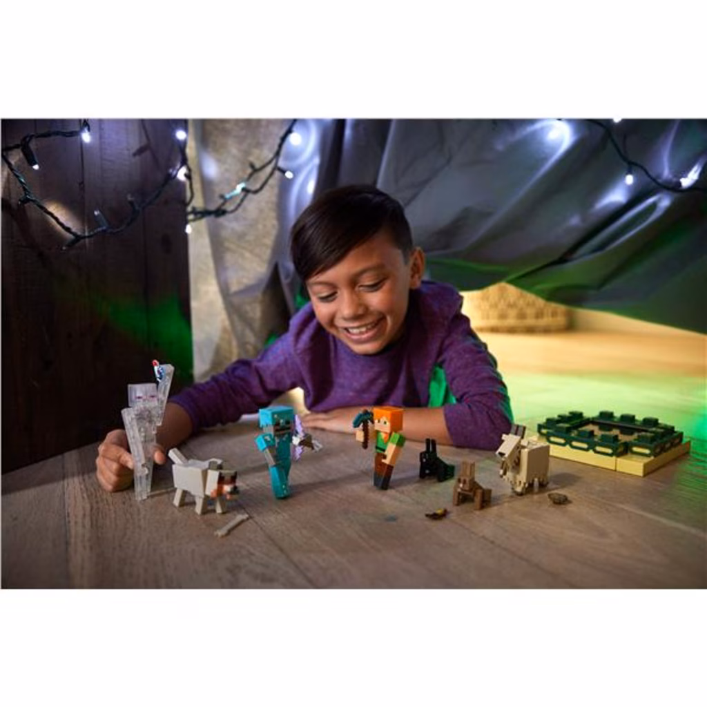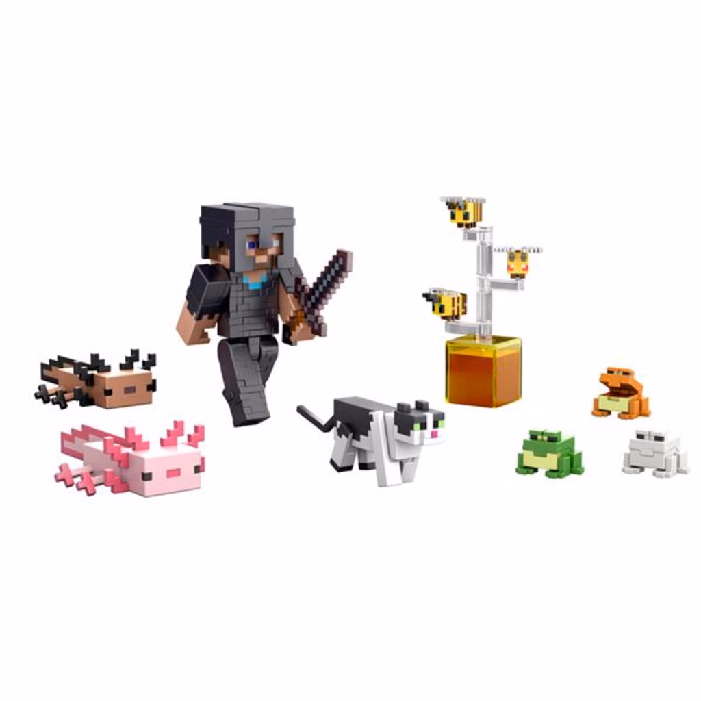 Cattura le grandi emozioni di Minecraft con questi personaggi e accessori in scala da 9,5 cm! Ogni personaggio è fedele al design pixelato caratteristico del videogioco e, grazie agli accessori iconici inclusi, collezionarli sarà ancora più divertente. I personaggi, snodati e con articolazioni mobili, sono perfetti per giocare e da esporre per raccontare tante altre storie.