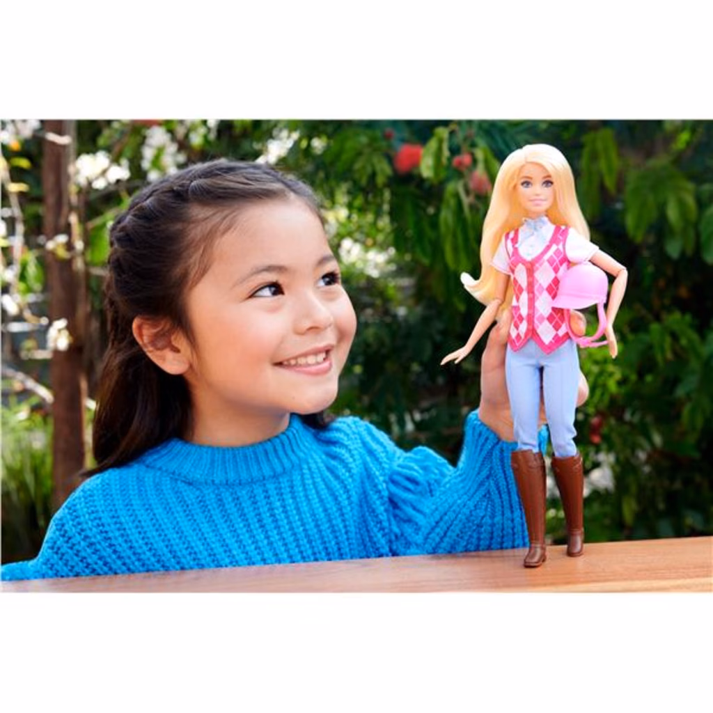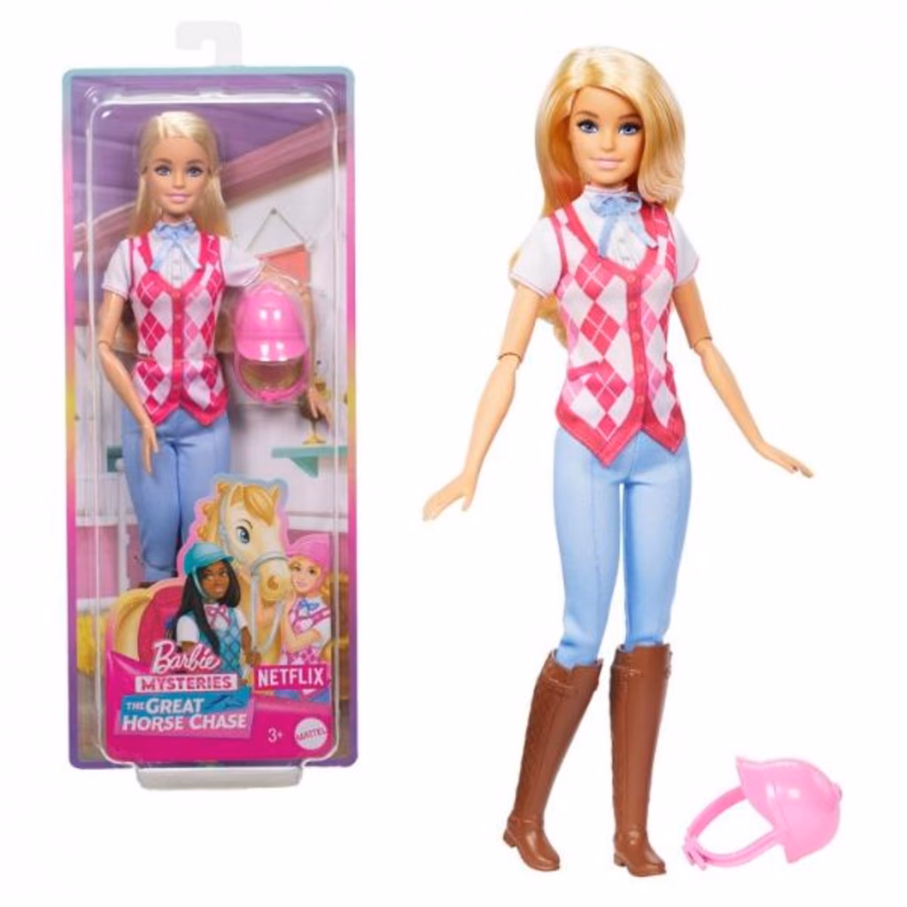 Barbie "Malibu" è pronta per avventure a cavallo! Con un elegante outfit da equitazione, è ispirata al personaggio della serie Netflix, Barbie Mysteries: The Great Horse Chase. Questa bambola alla moda indossa una camicia e un gilet rimovibili, pantaloni, stivali e caschetto. Inoltre, ha articolazioni che si piegano all'altezza di gomiti, polsi e ginocchia per un gioco di cavalcate realistico!