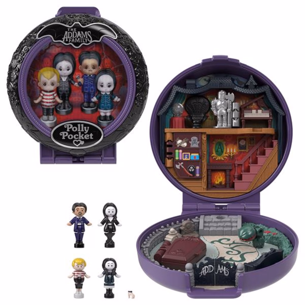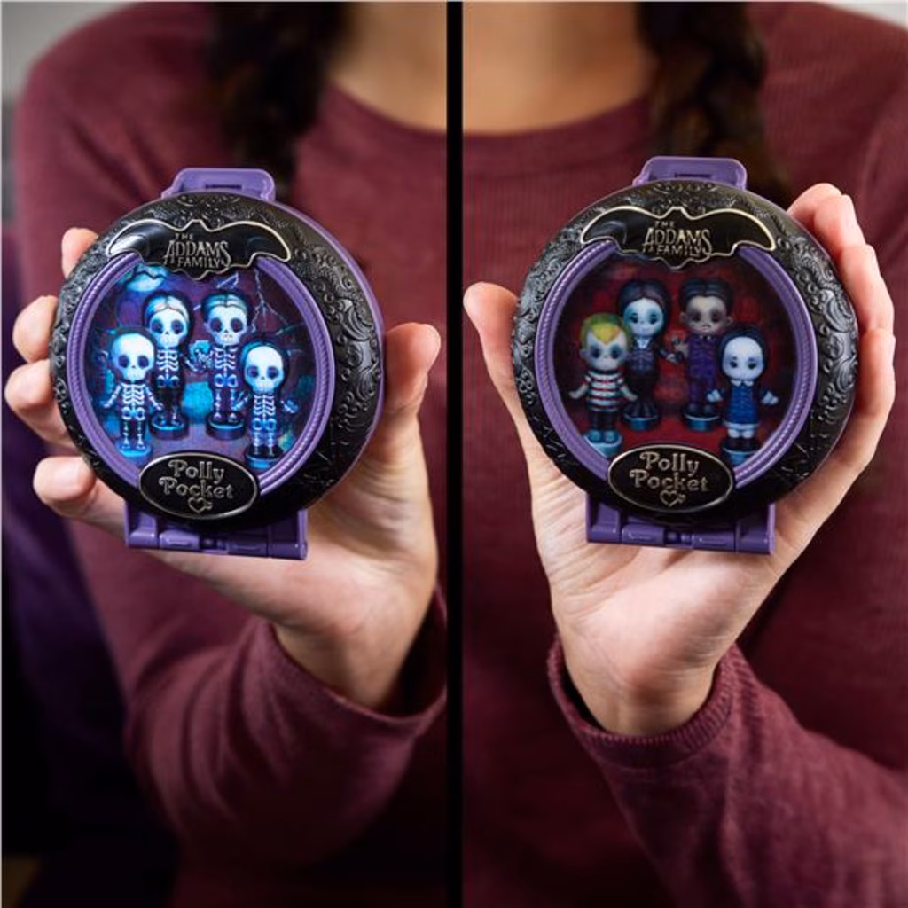 Questo cofanetto da collezione è ideale sia per i fan della famiglia Addams, sia per quelli di Polly Pocket. Colori e decorazioni possono variare.