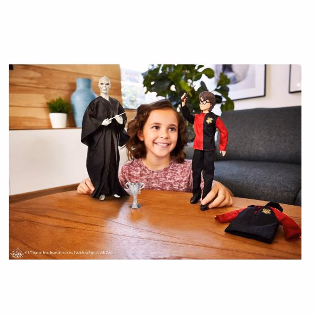Ricrea l'epico duello tra Harry Potter e Lord Voldemort con una confezione di 2 bambole da collezione ispirate ai rispettivi personaggi del film Harry Potter e il Calice di Fuoco! ?Gli accessori tratti dalla pellicola includono la Coppa Tremaghi e una bacchetta personalizzata per ciascuna bambola. Snodate su collo, spalle, fianchi, ginocchia, gomiti e polsi, le bambole di Harry Potter e Voldemort sono pronte per l'azione e per le pose da incantesimi! ?La confezione dal design speciale ricrea la scena nel cimitero della tenuta dei Riddle. Questo set Harry Potter da collezione è un'idea regalo unica per tutti i bambini dai 6 anni in su. I fan possono collezionare altre bambole e giocattoli di Harry Potter per ricostruire il mondo del maghetto e creare storie magiche!