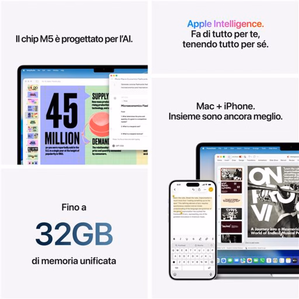 Fa tutto. E subito. Il chip M5 rende ogni operazione più fluida e veloce: te ne accorgi quando lavori con più app e pannelli aperti in contemporanea, quando monti video 4K o quando ti immergi in giochi come InZOI. E il design senza ventola rende tutto supersilenzioso.Progettato per l AI. A partire dal chip.Per chi studia, gestisce un attività o svolge professioni creative: MacBook Air con M5 è progettato per sfruttare al meglio l AI nei flussi di lavoro quotidiani, sempre nel rispetto assoluto della tua privacy. Dalle potenti funzioni di Apple Intelligence in macOS e nelle app ai modelli linguistici di grandi dimensioni fino al vibe coding, tutto quel che fai è più efficiente e protetto che mai.Apple Intelligence. Fai tutto, come niente.Apple Intelligence è il sistema di intelligenza personale che rende più facile scrivere, creare e fare tutto ciò che vuoi. E grazie a funzioni di ultima generazione per la tutela della privacy, hai la certezza che nessuno potrà accedere ai tuoi dati, nemmeno Apple.macOS Un orizzonte di possibilità.macOS è progettato per adattarsi al tuo modo di lavorare, creare e comunicare, con app potenti e multitasking fluido.Nati per stare insieme.Mac e iPhone sono già straordinari da soli, ma insieme fanno faville. Grazie a Continuity, puoi passare da un dispositivo all altro in un attimo per condividere file e foto o continuare il lavoro che stai facendo.Un vero spettacolo.Il display Liquid Retina di MacBook Air supporta un miliardo di colori e ha una risoluzione incredibile. Foto e video sembrano saltar fuori dallo schermo grazie all elevato contrasto e alla nitidezza dei dettagli. E anche il testo è ultradefinito.Un tipo con molte connessioni.Il cavo di ricarica MagSafe si aggancia e si sgancia magneticamente in un attimo, così il tuo MacBook Air non rischia di venire trascinato a terra. Le due porte Thunderbolt 4 permettono di collegare dispositivi ad alta velocità e di ricaricare il tuo Mac. Il comodo jack per le cuffie funziona anche con i modelli ad alta impedenza. E il chip wireless Apple N1 supporta le tecnologie Wi-Fi 7 e Bluetooth 6, migliorando prestazioni e affidabilità.Un tocco di tranquillità.Il Touch ID sulla Magic Keyboard è il modo più semplice, veloce e sicuro per sbloccare il Mac, accedere agli account e autorizzare i pagamenti. E in più hai tecnologie di crittografia all avanguardia, una solida protezione contro i virus e aggiornamenti di sicurezza gratuiti e automatici per mantenere i tuoi dati al sicuro.