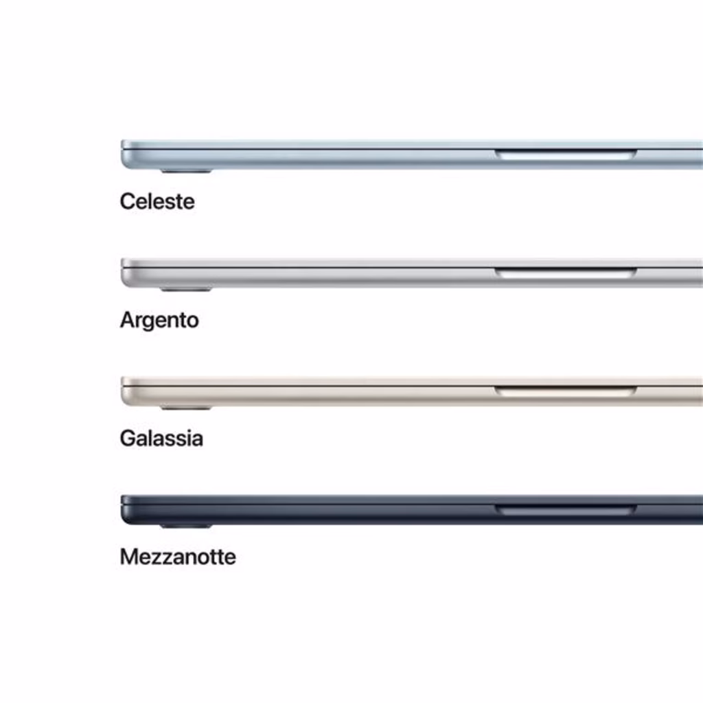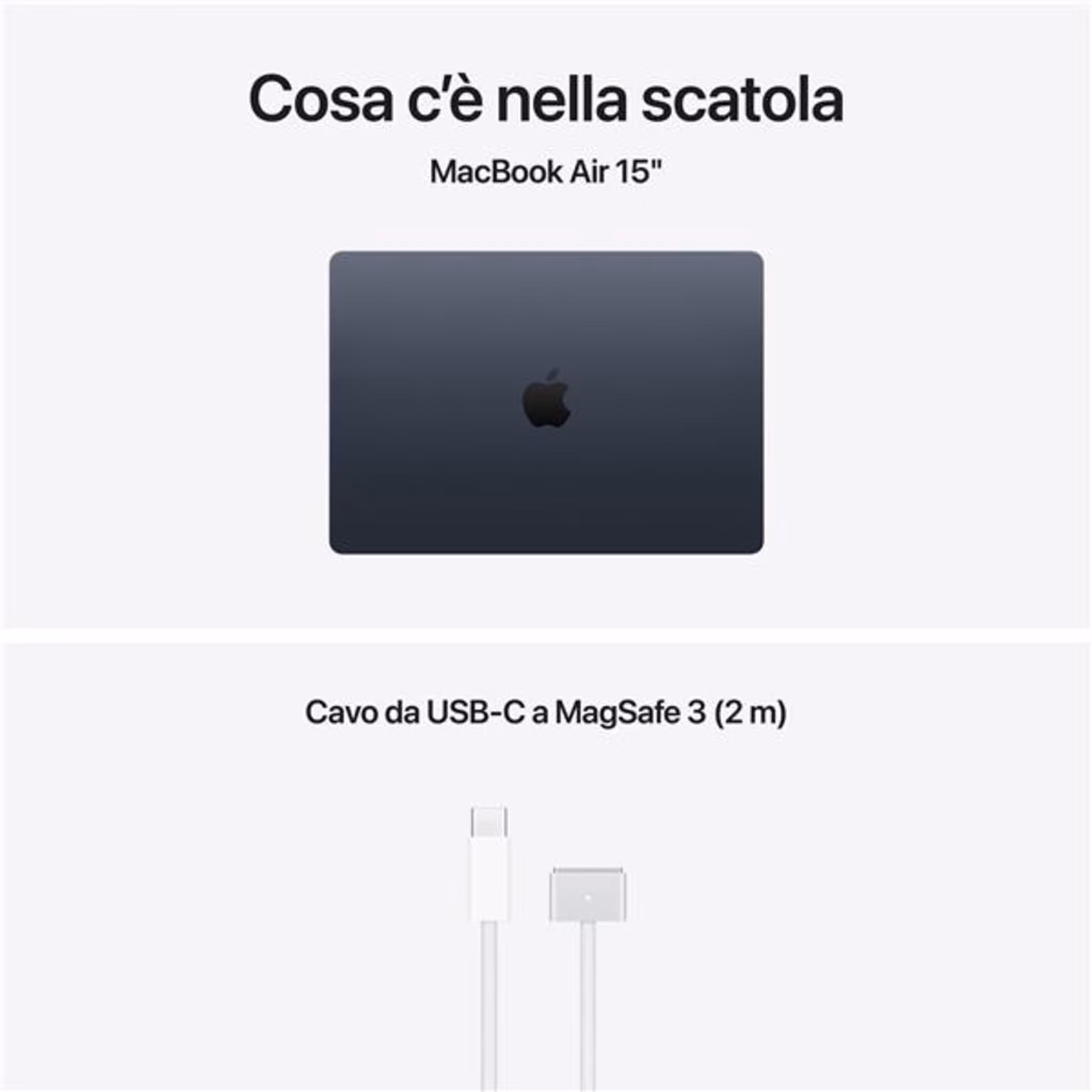 Apple MacBook Air 15" M5 chip 10-core CPU 10-core GPU, 16GB, 512GB SSD - MezzanotteMacBook Air 15". La potenza vola alto. MacBook Air con chip M5 offre prestazioni fulminee e potenti funzioni AI in un design incredibilmente portatile. Ha Apple Intelligence, fino a 18 ore di autonomia, e un archiviazione SSD veloce che parte da 512GB, così puoi lavorare, creare e giocare ovunque le tue giornate ti portino. Caratteristiche principali - CON I SUPERPOTERI DI M5 Con CPU e memoria unificata più veloci, il chip M5 ti dà prestazioni ancora migliori e più fluidità quando ti muovi tra le app, così tutto fila che è un piacere, dal multitasking ai flussi di lavoro creativi. Il potente Neural Engine e la GPU di nuova generazione con Neural Accelerator ti offrono una piattaforma straordinaria per l AI. - APPLE INTELLIGENCE Apple Intelligence è il sistema di intelligenza personale che rende più facile scrivere, creare e fare tutto ciò che vuoi. E grazie a funzioni di ultima generazione per la tutela della privacy, hai la certezza che nessuno potrà accedere ai tuoi dati, nemmeno Apple.- FINO A 18 ORE DI AUTONOMIA MacBook Air ha un autonomia incredibile con prestazioni straordinarie, così puoi affrontare un intera giornata di lavoro o studio senza preoccuparti di ricaricare. - BRILLANTE DISPLAY DA 15,3" Il display Liquid Retina supporta un miliardo di colori. Grazie all elevato contrasto e alla nitidezza dei dettagli, foto e video sembrano saltar fuori dallo schermo. E anche il testo è ultradefinito. - VIDEOCAMERA CENTER STAGE DA 12MP La funzione Inquadratura automatica ti tiene al centro della scena durante le videochiamate, e con Panoramica Scrivania puoi condividere una vista dall alto del tuo spazio di lavoro. Anche l audio è spettacolare, grazie ai tre microfoni in array e al sistema a sei altoparlanti con audio spaziale e supporto per Dolby Atmos.- SI CONNETTE A TUTTO MacBook Air ha due porte Thunderbolt 4, una porta di ricarica MagSafe e un jack per cuffie, oltre al chip Apple N1 wireless per il Wi Fi 7 e il Bluetooth 6. E ti permette di collegare fino a due monitor esterni. - MACOS METTE IL TURBO ALLE APP Le tue app preferite, anche quelle incluse come FaceTime e Messaggi, vanno a tutta velocità su macOS. E grazie alla protezione integrata contro i virus e agli aggiornamenti software gratuiti, il tuo Mac resta sempre efficiente e sicuro. - TI PIACE L IPHONE? ANCHE IL MAC TI CONQUISTERÀ Il Mac funziona in perfetta sintonia con gli altri dispositivi Apple. Puoi fare copia e incolla dall iPhone al Mac, e anche usare il Mac per inviare messaggi di testo o fare e ricevere chiamate FaceTime. - ALIMENTATORI N.B. MacBook Air (15") include un cavo di ricarica da USB C a MagSafe 3 senza alimentatore. Per ricaricare questo dispositivo è necessario un alimentatore USB C o un altra fonte di alimentazione USB PD da almeno 35W. Per una ricarica ottimale, Apple consiglia l alimentatore Apple da 35W a doppia porta USB C, oppure l alimentatore USB C Apple da 70W per sfruttare la ricarica rapida (fino al 50% di carica in 35 minuti).Fatto per fare strada.Con soli 1,23 kg di peso e uno spessore di poco più di un centimetro, MacBook Air è perfetto per infilarsi comodamente nella tua borsa e accompagnarti dovunque. È fatto per oltre il 50% di materiali riciclati e anche il robusto guscio, pensato per resistere all uso quotidiano, è in alluminio riciclato.M5. Una scheggia.AI a tutta velocità. MacBook Air offre prestazioni AI ultrarapide grazie alla potente combinazione di GPU, Neural Engine e memoria unificata del chip M5. E con un Neural Accelerator integrato in ogni core della GPU, le attività AI sono ancora più efficienti: dall upscaling di immagini con AI all esecuzione dei più recenti modelli linguistici di grandi dimensioni, potrai raggiungere livelli di produttività e creatività senza precedenti.
