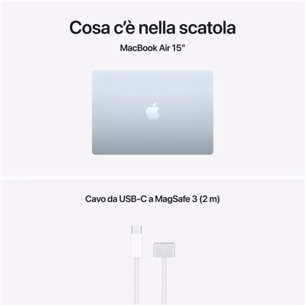 Apple MacBook Air 15" M5 chip 10-core CPU 10-core GPU, 16GB, 512GB SSD - CelesteMacBook Air 15". La potenza vola alto. MacBook Air con chip M5 offre prestazioni fulminee e potenti funzioni AI in un design incredibilmente portatile. Ha Apple Intelligence, fino a 18 ore di autonomia, e un archiviazione SSD veloce che parte da 512GB, così puoi lavorare, creare e giocare ovunque le tue giornate ti portino. Caratteristiche principali - CON I SUPERPOTERI DI M5 Con CPU e memoria unificata più veloci, il chip M5 ti dà prestazioni ancora migliori e più fluidità quando ti muovi tra le app, così tutto fila che è un piacere, dal multitasking ai flussi di lavoro creativi. Il potente Neural Engine e la GPU di nuova generazione con Neural Accelerator ti offrono una piattaforma straordinaria per l AI. - APPLE INTELLIGENCE Apple Intelligence è il sistema di intelligenza personale che rende più facile scrivere, creare e fare tutto ciò che vuoi. E grazie a funzioni di ultima generazione per la tutela della privacy, hai la certezza che nessuno potrà accedere ai tuoi dati, nemmeno Apple.- FINO A 18 ORE DI AUTONOMIA MacBook Air ha un autonomia incredibile con prestazioni straordinarie, così puoi affrontare un intera giornata di lavoro o studio senza preoccuparti di ricaricare. - BRILLANTE DISPLAY DA 15,3" Il display Liquid Retina supporta un miliardo di colori. Grazie all elevato contrasto e alla nitidezza dei dettagli, foto e video sembrano saltar fuori dallo schermo. E anche il testo è ultradefinito. - VIDEOCAMERA CENTER STAGE DA 12MP La funzione Inquadratura automatica ti tiene al centro della scena durante le videochiamate, e con Panoramica Scrivania puoi condividere una vista dall alto del tuo spazio di lavoro. Anche l audio è spettacolare, grazie ai tre microfoni in array e al sistema a sei altoparlanti con audio spaziale e supporto per Dolby Atmos.- SI CONNETTE A TUTTO MacBook Air ha due porte Thunderbolt 4, una porta di ricarica MagSafe e un jack per cuffie, oltre al chip Apple N1 wireless per il Wi Fi 7 e il Bluetooth 6. E ti permette di collegare fino a due monitor esterni. - MACOS METTE IL TURBO ALLE APP Le tue app preferite, anche quelle incluse come FaceTime e Messaggi, vanno a tutta velocità su macOS. E grazie alla protezione integrata contro i virus e agli aggiornamenti software gratuiti, il tuo Mac resta sempre efficiente e sicuro. - TI PIACE L IPHONE? ANCHE IL MAC TI CONQUISTERÀ Il Mac funziona in perfetta sintonia con gli altri dispositivi Apple. Puoi fare copia e incolla dall iPhone al Mac, e anche usare il Mac per inviare messaggi di testo o fare e ricevere chiamate FaceTime. - ALIMENTATORI N.B. MacBook Air (15") include un cavo di ricarica da USB C a MagSafe 3 senza alimentatore. Per ricaricare questo dispositivo è necessario un alimentatore USB C o un altra fonte di alimentazione USB PD da almeno 35W. Per una ricarica ottimale, Apple consiglia l alimentatore Apple da 35W a doppia porta USB C, oppure l alimentatore USB C Apple da 70W per sfruttare la ricarica rapida (fino al 50% di carica in 35 minuti).Fatto per fare strada.Con soli 1,23 kg di peso e uno spessore di poco più di un centimetro, MacBook Air è perfetto per infilarsi comodamente nella tua borsa e accompagnarti dovunque. È fatto per oltre il 50% di materiali riciclati e anche il robusto guscio, pensato per resistere all uso quotidiano, è in alluminio riciclato.M5. Una scheggia.AI a tutta velocità. MacBook Air offre prestazioni AI ultrarapide grazie alla potente combinazione di GPU, Neural Engine e memoria unificata del chip M5. E con un Neural Accelerator integrato in ogni core della GPU, le attività AI sono ancora più efficienti: dall upscaling di immagini con AI all esecuzione dei più recenti modelli linguistici di grandi dimensioni, potrai raggiungere livelli di produttività e creatività senza precedenti.