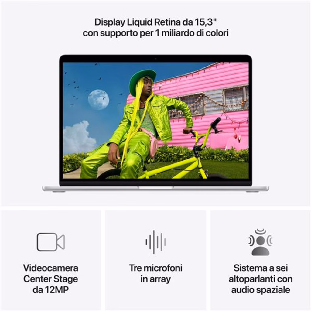 Apple MacBook Air 15" M5 chip 10-core CPU 10-core GPU, 24GB, 1TB SSD - ArgentoMacBook Air 15". La potenza vola alto. MacBook Air con chip M5 offre prestazioni fulminee e potenti funzioni AI in un design incredibilmente portatile. Ha Apple Intelligence, fino a 18 ore di autonomia, e un archiviazione SSD veloce che parte da 512GB, così puoi lavorare, creare e giocare ovunque le tue giornate ti portino. Caratteristiche principali - CON I SUPERPOTERI DI M5 Con CPU e memoria unificata più veloci, il chip M5 ti dà prestazioni ancora migliori e più fluidità quando ti muovi tra le app, così tutto fila che è un piacere, dal multitasking ai flussi di lavoro creativi. Il potente Neural Engine e la GPU di nuova generazione con Neural Accelerator ti offrono una piattaforma straordinaria per l AI. - APPLE INTELLIGENCE Apple Intelligence è il sistema di intelligenza personale che rende più facile scrivere, creare e fare tutto ciò che vuoi. E grazie a funzioni di ultima generazione per la tutela della privacy, hai la certezza che nessuno potrà accedere ai tuoi dati, nemmeno Apple.- FINO A 18 ORE DI AUTONOMIA MacBook Air ha un autonomia incredibile con prestazioni straordinarie, così puoi affrontare un intera giornata di lavoro o studio senza preoccuparti di ricaricare. - BRILLANTE DISPLAY DA 15,3" Il display Liquid Retina supporta un miliardo di colori. Grazie all elevato contrasto e alla nitidezza dei dettagli, foto e video sembrano saltar fuori dallo schermo. E anche il testo è ultradefinito. - VIDEOCAMERA CENTER STAGE DA 12MP La funzione Inquadratura automatica ti tiene al centro della scena durante le videochiamate, e con Panoramica Scrivania puoi condividere una vista dall alto del tuo spazio di lavoro. Anche l audio è spettacolare, grazie ai tre microfoni in array e al sistema a sei altoparlanti con audio spaziale e supporto per Dolby Atmos.- SI CONNETTE A TUTTO MacBook Air ha due porte Thunderbolt 4, una porta di ricarica MagSafe e un jack per cuffie, oltre al chip Apple N1 wireless per il Wi Fi 7 e il Bluetooth 6. E ti permette di collegare fino a due monitor esterni. - MACOS METTE IL TURBO ALLE APP Le tue app preferite, anche quelle incluse come FaceTime e Messaggi, vanno a tutta velocità su macOS. E grazie alla protezione integrata contro i virus e agli aggiornamenti software gratuiti, il tuo Mac resta sempre efficiente e sicuro. - TI PIACE L IPHONE? ANCHE IL MAC TI CONQUISTERÀ Il Mac funziona in perfetta sintonia con gli altri dispositivi Apple. Puoi fare copia e incolla dall iPhone al Mac, e anche usare il Mac per inviare messaggi di testo o fare e ricevere chiamate FaceTime. - ALIMENTATORI N.B. MacBook Air (15") include un cavo di ricarica da USB C a MagSafe 3 senza alimentatore. Per ricaricare questo dispositivo è necessario un alimentatore USB C o un altra fonte di alimentazione USB PD da almeno 35W. Per una ricarica ottimale, Apple consiglia l alimentatore Apple da 35W a doppia porta USB C, oppure l alimentatore USB C Apple da 70W per sfruttare la ricarica rapida (fino al 50% di carica in 35 minuti).Fatto per fare strada.Con soli 1,23 kg di peso e uno spessore di poco più di un centimetro, MacBook Air è perfetto per infilarsi comodamente nella tua borsa e accompagnarti dovunque. È fatto per oltre il 50% di materiali riciclati e anche il robusto guscio, pensato per resistere all uso quotidiano, è in alluminio riciclato.M5. Una scheggia.AI a tutta velocità. MacBook Air offre prestazioni AI ultrarapide grazie alla potente combinazione di GPU, Neural Engine e memoria unificata del chip M5. E con un Neural Accelerator integrato in ogni core della GPU, le attività AI sono ancora più efficienti: dall upscaling di immagini con AI all esecuzione dei più recenti modelli linguistici di grandi dimensioni, potrai raggiungere livelli di produttività e creatività senza precedenti.