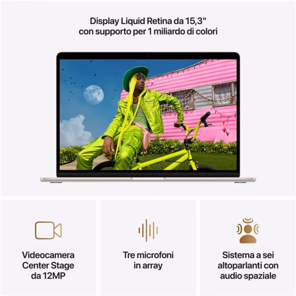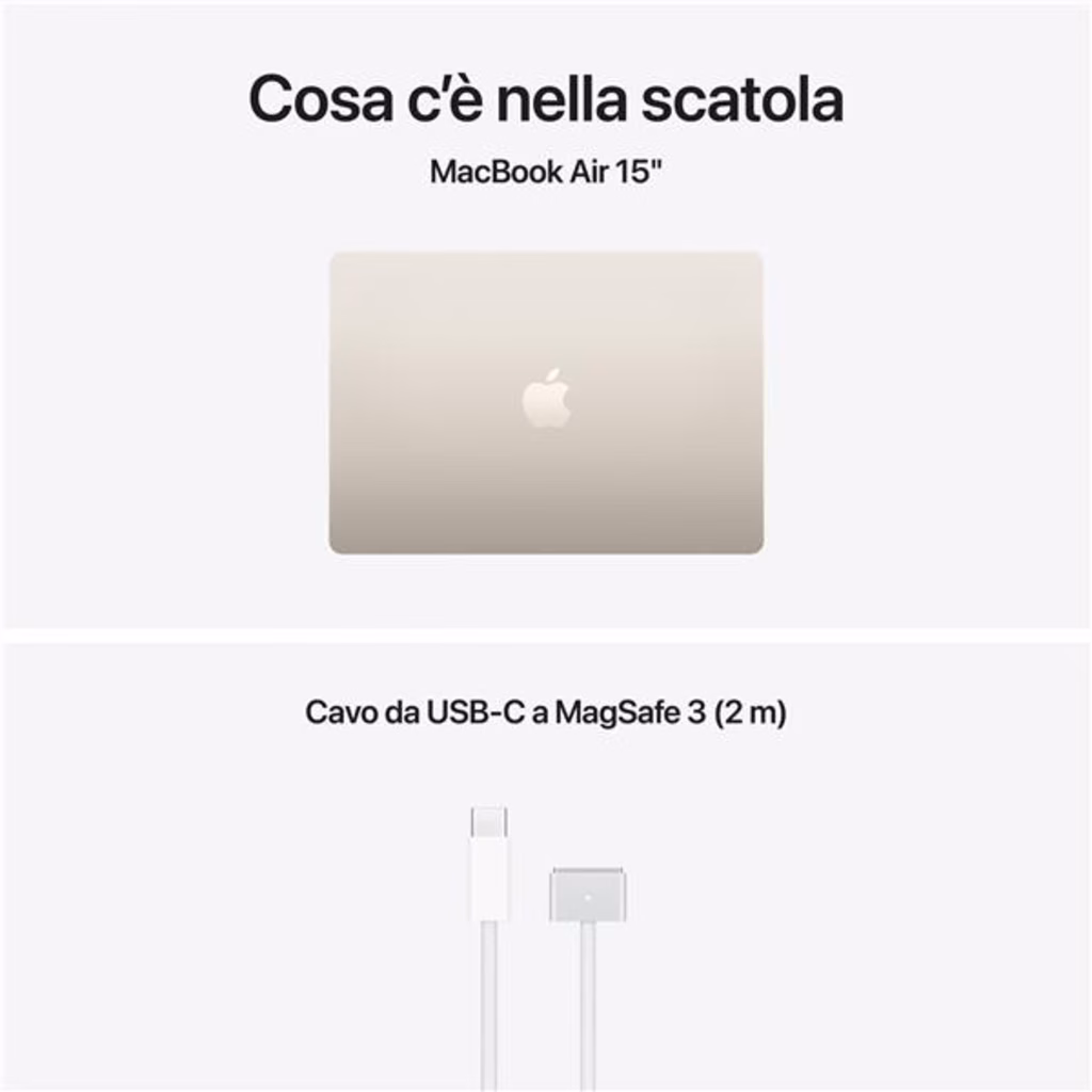 Apple MacBook Air 15" M5 chip 10-core CPU 10-core GPU, 24GB, 1TB SSD - GalassiaMacBook Air 15". La potenza vola alto. MacBook Air con chip M5 offre prestazioni fulminee e potenti funzioni AI in un design incredibilmente portatile. Ha Apple Intelligence, fino a 18 ore di autonomia, e un archiviazione SSD veloce che parte da 512GB, così puoi lavorare, creare e giocare ovunque le tue giornate ti portino. Caratteristiche principali - CON I SUPERPOTERI DI M5 Con CPU e memoria unificata più veloci, il chip M5 ti dà prestazioni ancora migliori e più fluidità quando ti muovi tra le app, così tutto fila che è un piacere, dal multitasking ai flussi di lavoro creativi. Il potente Neural Engine e la GPU di nuova generazione con Neural Accelerator ti offrono una piattaforma straordinaria per l AI. - APPLE INTELLIGENCE Apple Intelligence è il sistema di intelligenza personale che rende più facile scrivere, creare e fare tutto ciò che vuoi. E grazie a funzioni di ultima generazione per la tutela della privacy, hai la certezza che nessuno potrà accedere ai tuoi dati, nemmeno Apple.- FINO A 18 ORE DI AUTONOMIA MacBook Air ha un autonomia incredibile con prestazioni straordinarie, così puoi affrontare un intera giornata di lavoro o studio senza preoccuparti di ricaricare. - BRILLANTE DISPLAY DA 15,3" Il display Liquid Retina supporta un miliardo di colori. Grazie all elevato contrasto e alla nitidezza dei dettagli, foto e video sembrano saltar fuori dallo schermo. E anche il testo è ultradefinito. - VIDEOCAMERA CENTER STAGE DA 12MP La funzione Inquadratura automatica ti tiene al centro della scena durante le videochiamate, e con Panoramica Scrivania puoi condividere una vista dall alto del tuo spazio di lavoro. Anche l audio è spettacolare, grazie ai tre microfoni in array e al sistema a sei altoparlanti con audio spaziale e supporto per Dolby Atmos.- SI CONNETTE A TUTTO MacBook Air ha due porte Thunderbolt 4, una porta di ricarica MagSafe e un jack per cuffie, oltre al chip Apple N1 wireless per il Wi Fi 7 e il Bluetooth 6. E ti permette di collegare fino a due monitor esterni. - MACOS METTE IL TURBO ALLE APP Le tue app preferite, anche quelle incluse come FaceTime e Messaggi, vanno a tutta velocità su macOS. E grazie alla protezione integrata contro i virus e agli aggiornamenti software gratuiti, il tuo Mac resta sempre efficiente e sicuro. - TI PIACE L IPHONE? ANCHE IL MAC TI CONQUISTERÀ Il Mac funziona in perfetta sintonia con gli altri dispositivi Apple. Puoi fare copia e incolla dall iPhone al Mac, e anche usare il Mac per inviare messaggi di testo o fare e ricevere chiamate FaceTime. - ALIMENTATORI N.B. MacBook Air (15") include un cavo di ricarica da USB C a MagSafe 3 senza alimentatore. Per ricaricare questo dispositivo è necessario un alimentatore USB C o un altra fonte di alimentazione USB PD da almeno 35W. Per una ricarica ottimale, Apple consiglia l alimentatore Apple da 35W a doppia porta USB C, oppure l alimentatore USB C Apple da 70W per sfruttare la ricarica rapida (fino al 50% di carica in 35 minuti).Fatto per fare strada.Con soli 1,23 kg di peso e uno spessore di poco più di un centimetro, MacBook Air è perfetto per infilarsi comodamente nella tua borsa e accompagnarti dovunque. È fatto per oltre il 50% di materiali riciclati e anche il robusto guscio, pensato per resistere all uso quotidiano, è in alluminio riciclato.M5. Una scheggia.AI a tutta velocità. MacBook Air offre prestazioni AI ultrarapide grazie alla potente combinazione di GPU, Neural Engine e memoria unificata del chip M5. E con un Neural Accelerator integrato in ogni core della GPU, le attività AI sono ancora più efficienti: dall upscaling di immagini con AI all esecuzione dei più recenti modelli linguistici di grandi dimensioni, potrai raggiungere livelli di produttività e creatività senza precedenti.