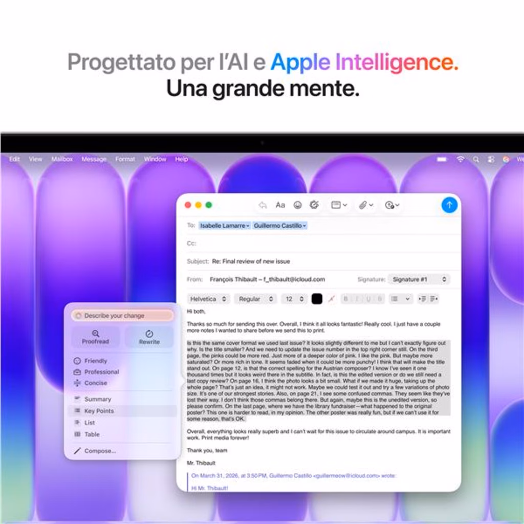 Sfreccia tra i task di tutti i giorni. Il chip A18 Pro è l unione perfetta tra prestazioni ed efficienza, per far volare le tue app preferite e svolgere attività AI in scioltezza.Il trionfo dei sensi.Foto e video sembrano prendere vita grazie al grande contrasto e alla nitidezza dei dettagli. Il testo è ben definito per una lettura confortevole. E i due altoparlanti a diffusione laterale ti avvolgono con un suono bello pieno.Da detto a fatto.Le app e gli strumenti di intelligenza artificiale che usi di più, come ChatGPT e Canva, girano che è una bellezza su MacBook Neo. Con un esperienza AI così fluida e versatile, il tuo lavoro e le tue passioni si aprono a nuovi orizzonti.Progettato per Apple Intelligence.Apple Intelligence è il sistema di intelligenza personale che rende più facile scrivere, creare e fare tutto ciò che vuoi. Ed è già integrata in MacBook Neo.