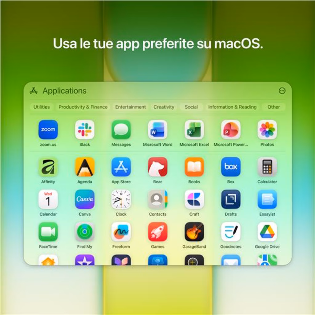 C è una perfetta sintonia.Progettato per essere intuitivo.MacBook Neo è facile e immediato fin dal primo momento: anche se non hai mai usato un Mac, ti sentirai subito a casa.Compromessi zero.Come ogni Mac, anche MacBook Neo è progettato con una serie di funzioni di sicurezza evolute. Grazie alla crittografia automatica dei dati, alla protezione antivirus gratuita e agli aggiornamenti software regolari, hai la certezza di poter andare online senza rischi per te e per le tue informazioni.