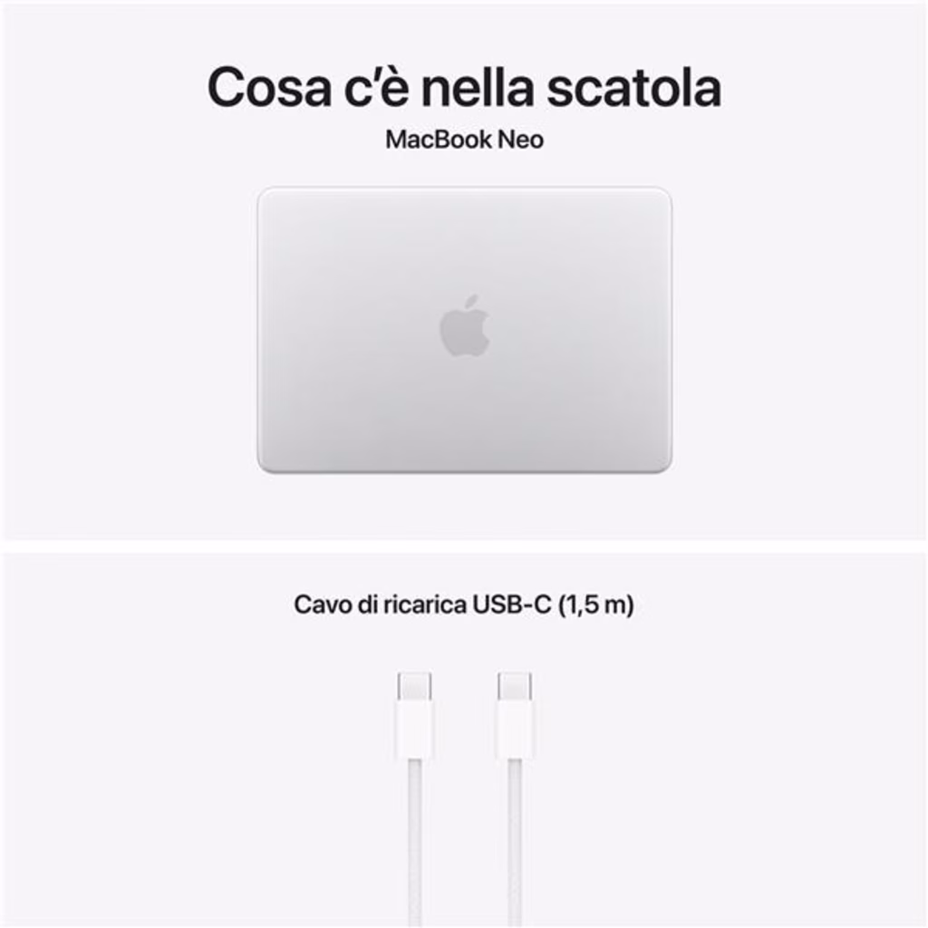Apple MacBook Neo 13"A18 Pro chip 6-core CPU 5-core GPU 8GB 256GB SSD - ArgentoMacBook Neo. Un Mac eccezionale. A un prezzo che non ti aspetti. Pronto ad affrontare ogni giornata insieme a te, MacBook Neo sfreccia tra i task e le app di tutti i giorni. Ha un robusto design in alluminio in quattro splendidi colori, uno spettacolare display Liquid Retina da 13", il chip A18 Pro progettato per l AI e Apple Intelligence, e fino a 16 ore di autonomia. È un Mac eccezionale, a un prezzo che non ti aspetti. Caratteristiche principali - LA LINEA DI MACBOOK PIÙ VARIOPINTA DI SEMPRE Scegli tra argento, rosa pastello, giallo agrume e indaco: ciascuno con tastiera in tinta per creare un look coordinato. E grazie al suo robusto design in alluminio, MacBook Neo ti segue ovunque. - PRESTAZIONI PER LE ATTIVITÀ QUOTIDIANE Sin da subito, MacBook Neo con il chip A18 Pro offre performance e funzioni AI che ti aiutano a fare tutto in scioltezza: ritoccare le foto di famiglia, lavorare con i fogli di calcolo, riassumere gli appunti delle lezioni con l AI, o lanciarti nell ultimo gioco di Apple Arcade. - FINO A 16 ORE DI AUTONOMIA Con una batteria che dura una giornata intera, MacBook Neo è pronto a seguirti nelle tue attività quotidiane e negli studi, dalle lezioni del mattino alle maratone notturne prima dell esame. - SPETTACOLARE DISPLAY DA 13" Lo splendido display Liquid Retina è una gioia per gli occhi. Con una risoluzione di 2408×1506 pixel, fino a 500 nit di luminosità e il supporto per un miliardo di colori, le immagini sono brillanti e il testo nitidissimo. - FATTI VEDERE E SENTIRE ALLA GRANDE MacBook Neo ha una videocamera FaceTime HD a 1080p, due microfoni in array che rendono più chiara la tua voce durante le chiamate, e due altoparlanti a diffusione laterale con audio spaziale per offrirti un suono avvolgente. - PROGETTATO PER L AI Il chip Apple e i suoi principali componenti sono progettati per gestire in modo efficiente le attività AI on device. Apple Intelligence rende più facile scrivere, creare e fare tutto ciò che vuoi, con funzioni di ultima generazione per la tutela della privacy. - MACOS METTE IL TURBO ALLE APP Su macOS le tue app preferite vanno a tutta velocità, comprese quelle di serie come FaceTime e Messaggi. - SE AMI IL TUO IPHONE, AMERAI ANCHE IL MAC Il Mac funziona in perfetta sintonia con gli altri dispositivi Apple. Puoi copiare e incollare dall iPhone al Mac, e usare il Mac per inviare messaggi di testo o rispondere alle chiamate FaceTime. - PRIVACY E SICUREZZA La protezione antivirus integrata e gli aggiornamenti software gratuiti aiutano a mantenere il tuo MacBook Neo sicuro e perfettamente efficiente. FileVault protegge i tuoi file con la crittografia, così solo tu potrai accedervi. Se perdi il tuo Mac o ti viene rubato, l app Dov è può aiutarti a ritrovarlo. Sul modello di MacBook Neo con tasto Blocco, ti basta premerlo per riattivare e bloccare lo schermo e accendere o spegnere il Mac. E sul modello con Touch ID, puoi usare la tua impronta digitale per sbloccare il Mac, autorizzare i pagamenti, e accedere alle app e ai siti web. - ALIMENTATORI N.B. MacBook Neo include un cavo di ricarica USB C senza alimentatore. Per ricaricare questo dispositivo è necessario un alimentatore USB C o un altra fonte di alimentazione USB PD da almeno 20W. Per una ricarica ottimale, Apple consiglia l alimentatore USB C Apple da 20W.Un colpo di fulmine.Questo è MacBook Neo, un Mac eccezionale a un prezzo che non ti aspetti. Con un design robusto, splendidi colori e potenti funzioni, ha tutto per farti scoprire la magia di Mac ogni giorno. Dai il benvenuto all ultimo arrivato in famiglia.La sua potenza è la tua forza.Il chip A18 Pro è un gran tuttofare: puoi usare le tue app preferite, svolgere in scioltezza le attività di ogni giorno, scatenare la creatività e lanciarti nei giochi più pazzeschi. Ovunque ti porti la tua giornata, hai la velocità che serve per tenere il passo delle idee.