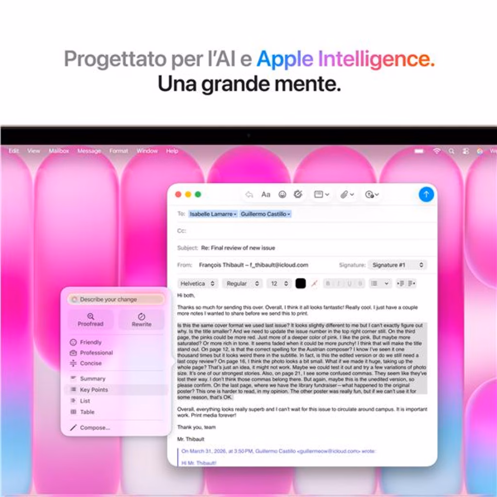 Sfreccia tra i task di tutti i giorni. Il chip A18 Pro è l unione perfetta tra prestazioni ed efficienza, per far volare le tue app preferite e svolgere attività AI in scioltezza.Il trionfo dei sensi.Foto e video sembrano prendere vita grazie al grande contrasto e alla nitidezza dei dettagli. Il testo è ben definito per una lettura confortevole. E i due altoparlanti a diffusione laterale ti avvolgono con un suono bello pieno.Da detto a fatto.Le app e gli strumenti di intelligenza artificiale che usi di più, come ChatGPT e Canva, girano che è una bellezza su MacBook Neo. Con un esperienza AI così fluida e versatile, il tuo lavoro e le tue passioni si aprono a nuovi orizzonti.Progettato per Apple Intelligence.Apple Intelligence è il sistema di intelligenza personale che rende più facile scrivere, creare e fare tutto ciò che vuoi. Ed è già integrata in MacBook Neo.
