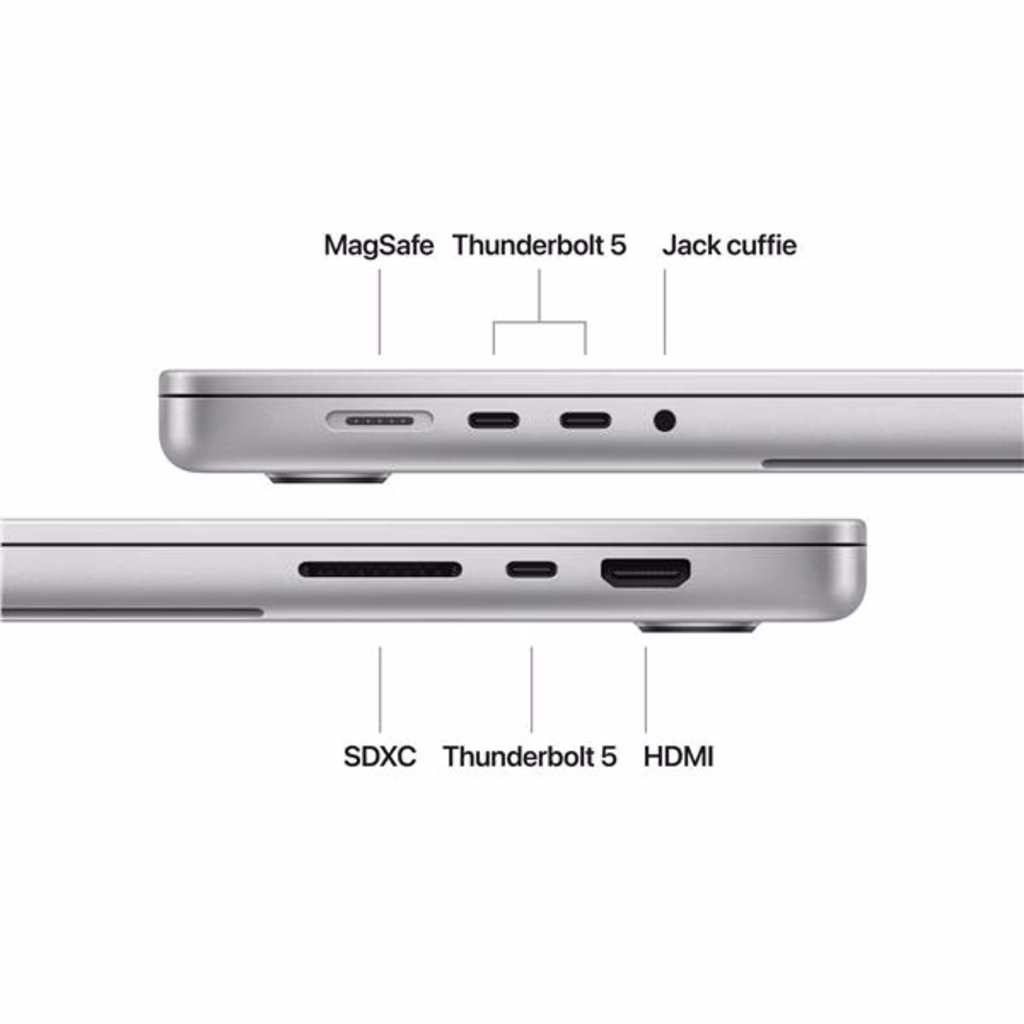 • Tre porte Thunderbolt 5, porta HDMI, slot SDXC card, jack cuffie, porta MagSafe 3