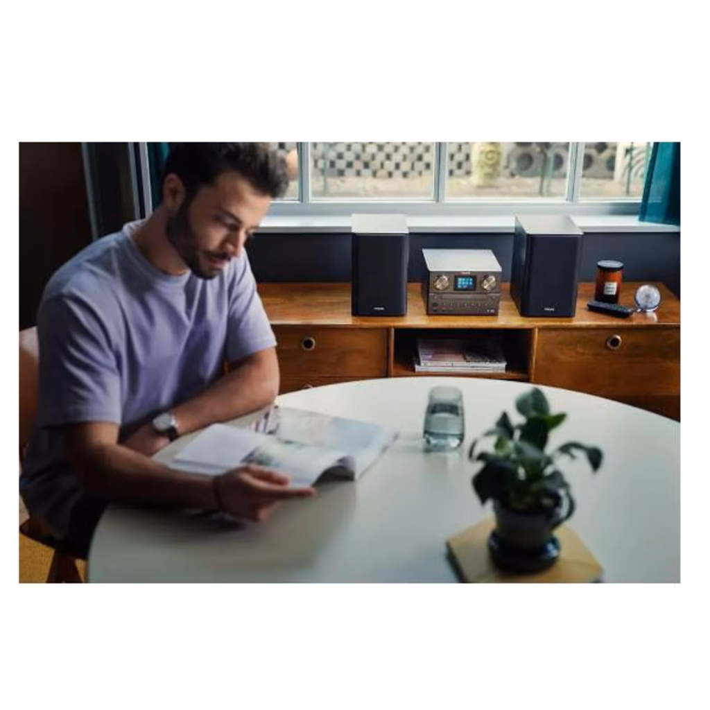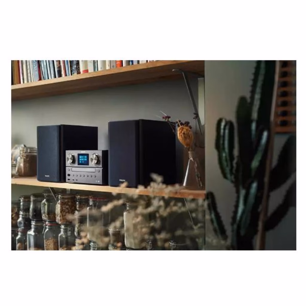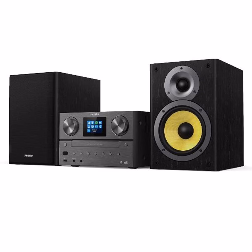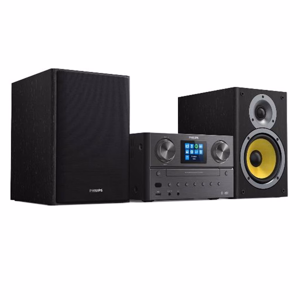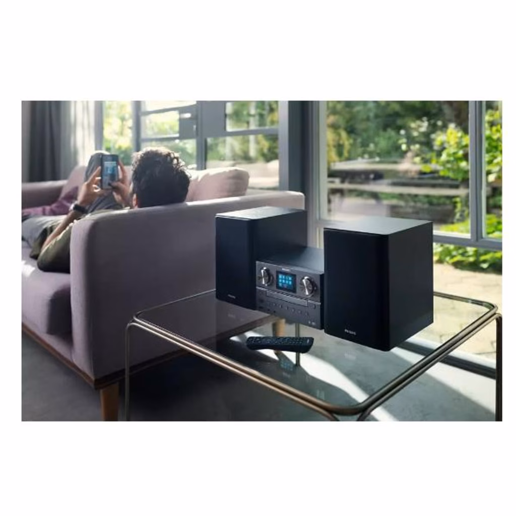 Riempi la stanza con l'audio che ami. Grazie alla radio via Internet, Spotify Connect, Bluetooth e un lettore CD, questo elegante sistema micro è in grado di riprodurre qualsiasi contenuto. Inoltre puoi sintonizzarti sulla radio DAB+ o FM con un audio potente da 100 W.