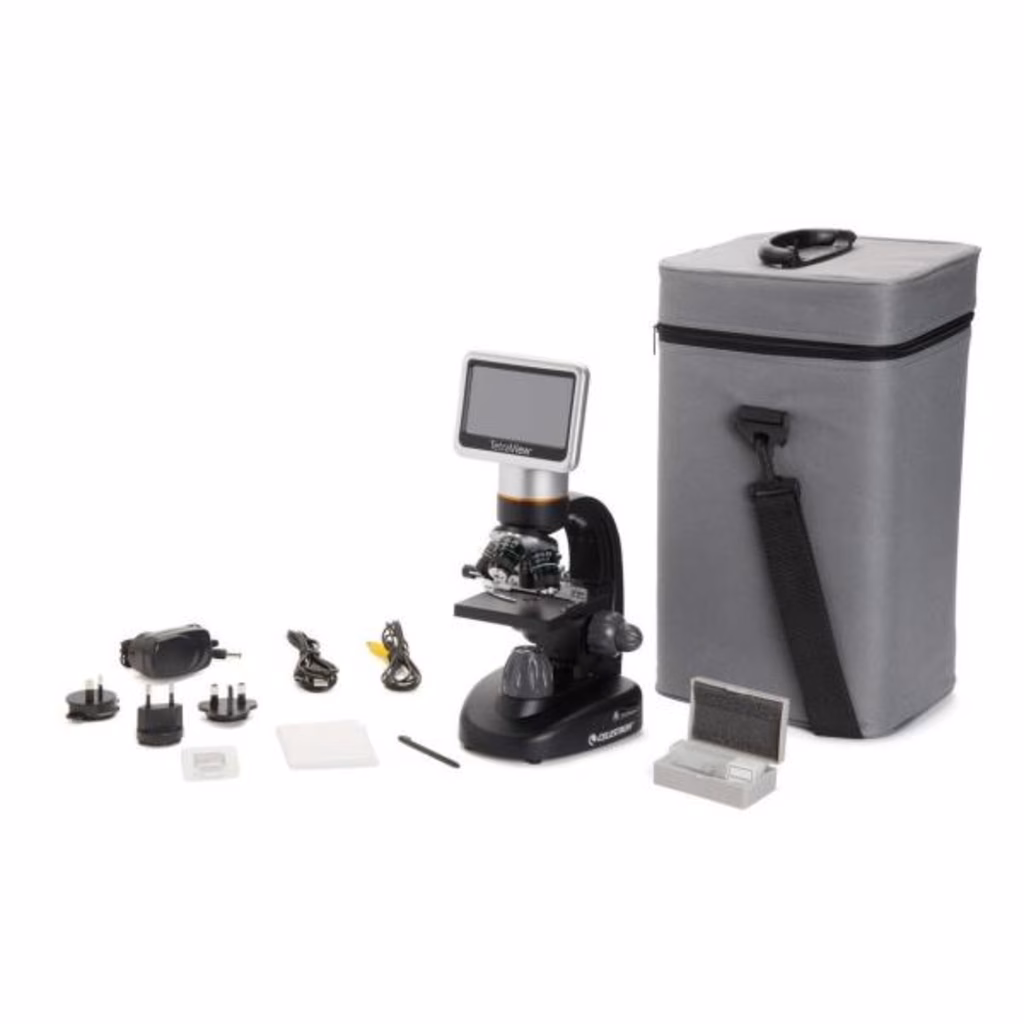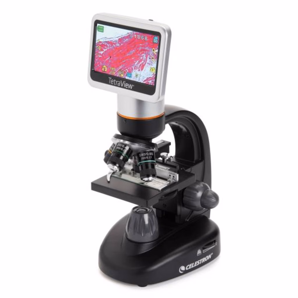 Il microscopio digitale LCD Tetraview è un microscopio professionale e versatile dotato di schermo Touch-Screen a colori LCD da 3,5″. Il nome Tetraview deriva dal fatto che il microscopio è dotato di quattro obiettivi a lenti acromatiche inclusi in una torretta meccanica a rotazione. Il display 4.3″ TFT touch screen a colori è ruotabile fino a 180° e consente di condividere l’osservazione con altre persone; lo schermo visualizzerà immagini nitide e contrastate e la fotocamera digitale incorporata con sensore CMOS da 5MP vi permetteranno di riprendere immagini e video ad alta risoluzione che potrete archiviare nella scheda SD-card da 2GB inclusa come accessorio. Il microscopio Tetraview include il software Celestron Capture Pro per l’utilizzo con il PC, e una uscita TV, per visualizzare le immagini ripresa dal microscopio su qualsiasi schermo. Con ingrandimenti da 40x a 400x (1600x con zoom digitale), il microscopio Tetraview è ideale per la visualizzazione dettagliata di campioni ad alta risoluzione nell’ambito dei laboratori, scuole, ricerca scientifica ed altro ancora.