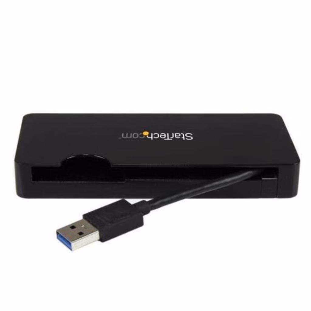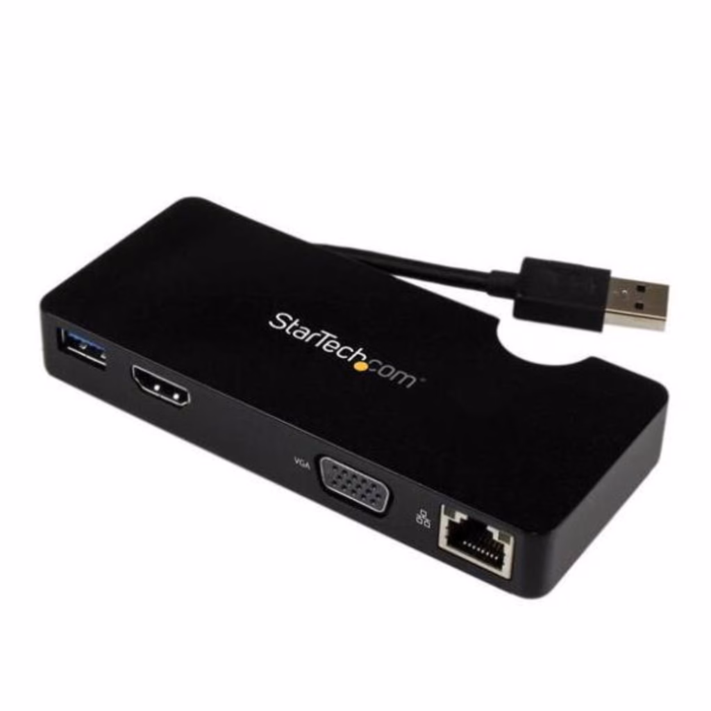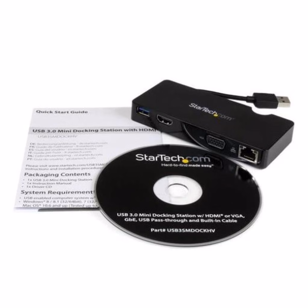 La docking station da viaggio per laptop consente di trasformare il laptop o Ultrabook  in una workstation portatile. Consente di aggiungere un'uscita video HDMI® o VGA, una porta hub USB 3.0 e una porta RJ45 Gigabit Ethernet utilizzando un unico collegamento host USB 3.0. Il dock adatto per il viaggio consente di superare le limitazioni delle porte dei moderni computer portatili, risultando ideale per il laptop, Microsoft Surface Pro 4, Surface Pro 3, Surface 3, Surface Pro 2 o Surface Book..Ora è possibile evitare il fastidio di dover trasportare più adattatori. Consolidando quattro porte di collegamento fondamentali in un solo comodo dispositivo, il dock da viaggio rappresenta l'accessorio ideale per il laptop. Presenta un design compatto e leggero che si adatta senza problemi alla borsa da viaggio e presenta inoltre un cavo di collegamento host integrato, che si inserisce perfettamente nella custodia per docking station.Una soluzione versatile per il collegamento di un display aggiuntivo al laptop, la docking station da viaggio offre un'uscita video HDMI con audio, o un'uscita video VGA, fornendo due interfacce note per il collegamento di un televisore, proiettore o monitor come display secondario, con il supporto di risoluzioni fino a 2048x1152 (QWXGA). Sfruttando l'interfaccia USB 3.0 (5 Gbps) ad elevata larghezza di banda che mette a disposizione un'uscita video flessibile, una porta hub USB 3.0 e Gigabit Ethernet, è possibile configurare rapidamente una workstation multifunzione quando si è in viaggio, senza sacrificare una delle porte USB del laptop.La configurazione è semplice e senza problemi; questa docking station da viaggio scarica automaticamente il driver più recente quando viene collegata a un sistema Windows® con una connessione di rete attiva.USB3SMDOCKHV è dotato della garanzia di 3 anni StarTech.com e del supporto tecnico gratuito a vita.