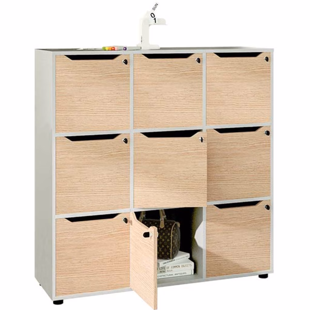 Materiale bilaminato nobilitato melaminico spessore conforme norme UNI e EN classe E1, antigraffio ed antiriflesso. Programma di contenitori a 9 caselle allestibili a giorno oppure con ante complete di serratura. Ideali sia per larchiviazione di documenti che in tutti quei contesti in cui è opportuno offrire la possibilità di lasciare oggetti personali custoditi allinterno di un vano chiuso a chiave. Il design delle ante permette, anche da chiuse, di inserire documenti allinterno della casella. Utilizzabile anche come casellario. Le singole caselle misurano 372x372 mm (L x H) e complete di ante hanno una profondità utile di 366 mm. Dotate di piedini livellabili in altezza. Modelli e dimensioni:  9 caselle: L1190 P400 H1206 mm Top sp. 18 mm. Fianchi, ripiani e base sp. 18 mm. Dietro sp. 10 mm Ante sp. 18 mm.