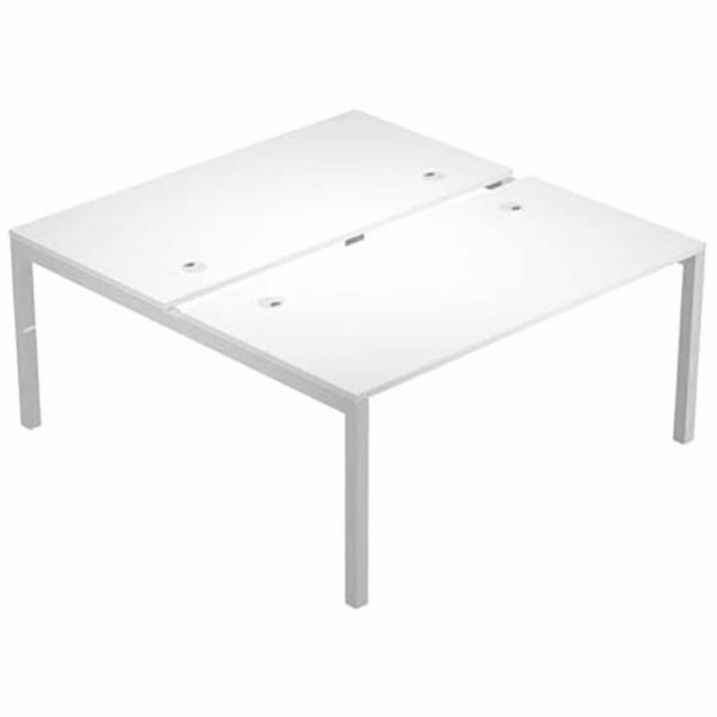 Scrivania doppia dimensioni cm L160xP168xH73 (singolo piano L160x80). Piani in agglomerato ligneo nobilitato melaminico sp.25mm, bordati in abs sp.2 mm. Struttura in metallo, con solida gamba di sezione 50x50 mm, finitura bianca. Piani di lavoro forniti di due passacavi diametro 80 mm. Finitura piano bianco