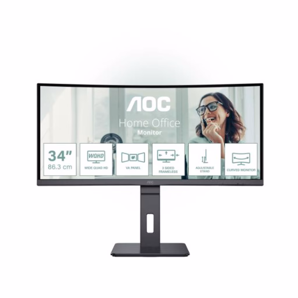 Display VA curvo WQHD da 34" per una visione coinvolgente e maggiore produttivitàAOC CU34P3CV è uno schermo VA curvo da 34" WQHD (3440 x 1440) con un attraente design a cornice ultrasottile su tre lati che ti offre una visione coinvolgente. Il formato Wide QHD 21:9 espande il tuo campo visivo offrendoti al contempo una visione avvolgente per un'elevata esperienza cinematografica. Il pannello offre una luminosità di 300 nit e un ampi angolo di visione di 178/178°, insieme a due altoparlanti integrati da 5 W + 5 W per migliorare la produttività quotidiana negli odierni ambienti flessibili di lavoro. CU34P3CV è pronto per aumentare la tua produttività con USB-C che supporta Power Delivery fino a 65 W, trasferimento dati e modalità DP-alt. La connettività di questo monitor è aumentata da hub USB e RJ-45. Tenendo ben presente la sostenibilità, una serie di certificazioni ambientali tra cui EPA, TCO ed EPEAT completa questo monitor.