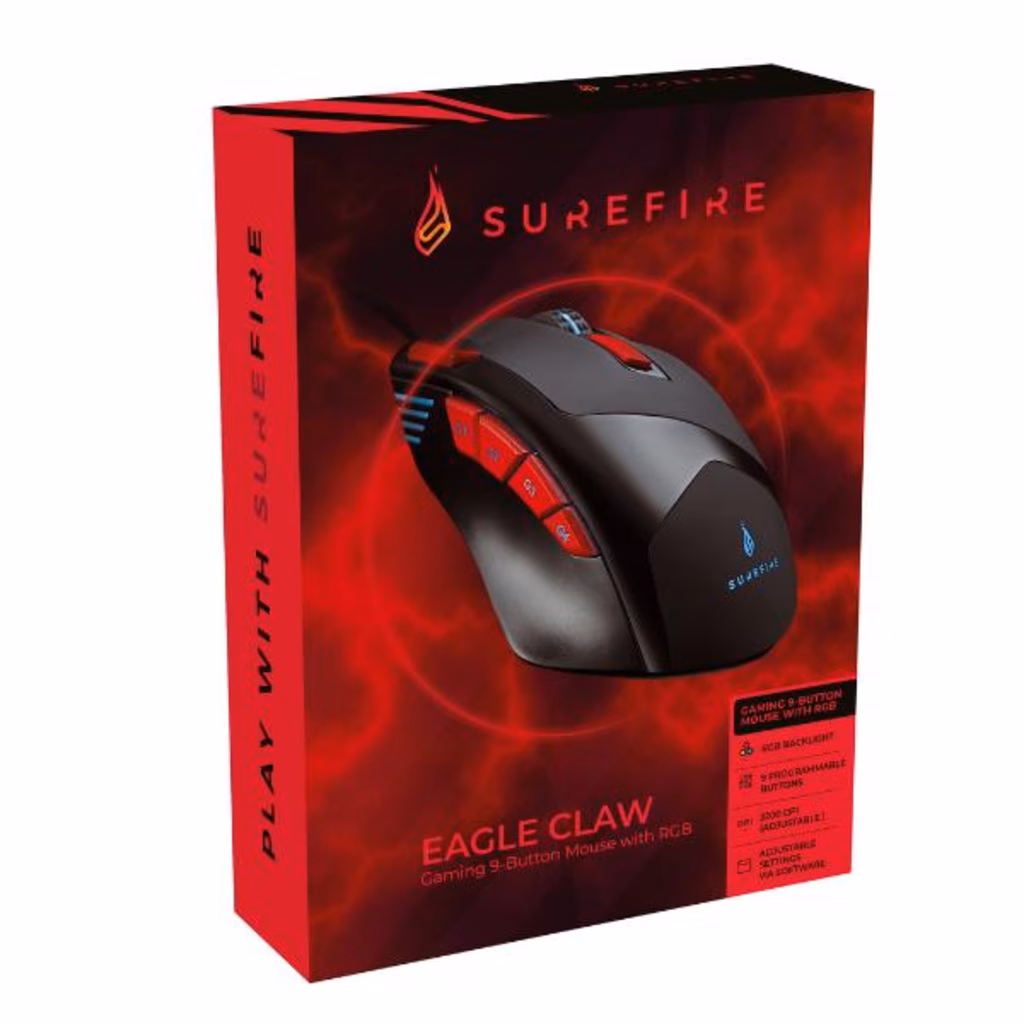 Il mouse gaming SureFire Eagle Claw dispone di 9 pulsanti programmabili, illuminazione RGB a gamma completa e risoluzione fino a 3200 DPI, per creare la configurazione ideale e ottenere il massimo durante il gioco.