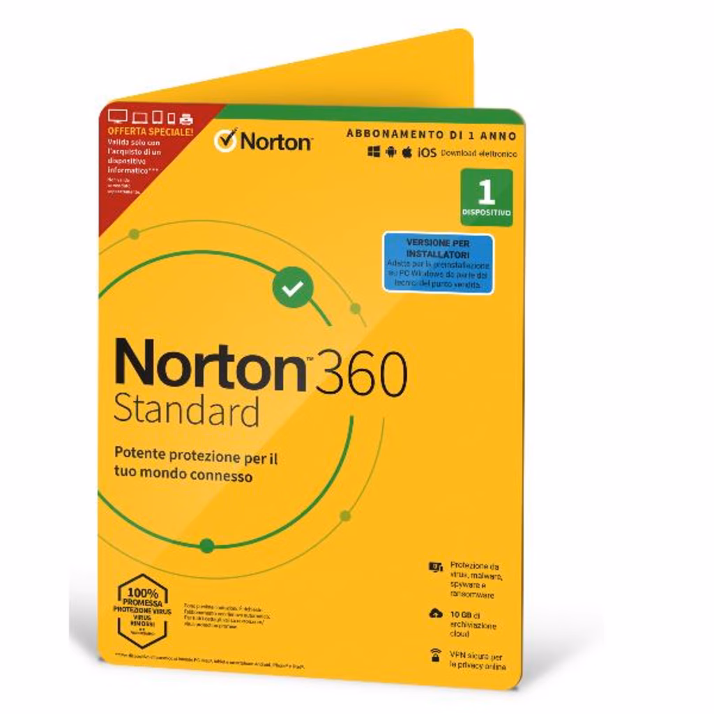 Norton 360 Standard offre una potente protezione potenti per i tuoi dispositivi e la tua privacy online tutto in un'unica soluzione. I tuoi PC, Mac®, tablet e smartphone vengono protetti da virus, ransomware, phishing e altre minacce online mentre effettui transazioni bancarie, fai acquisti e navighi online.
