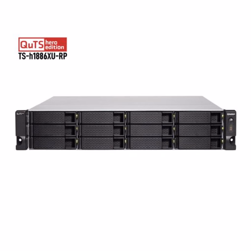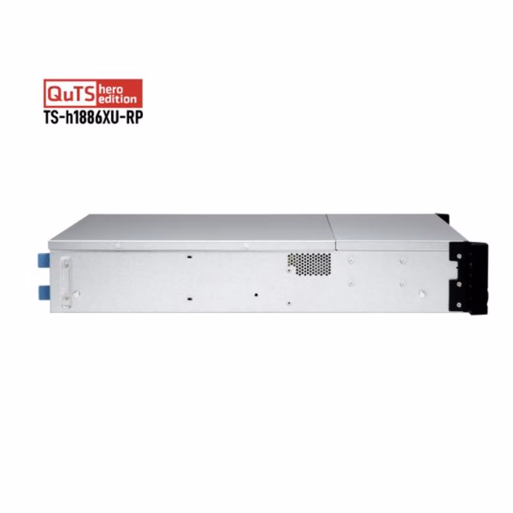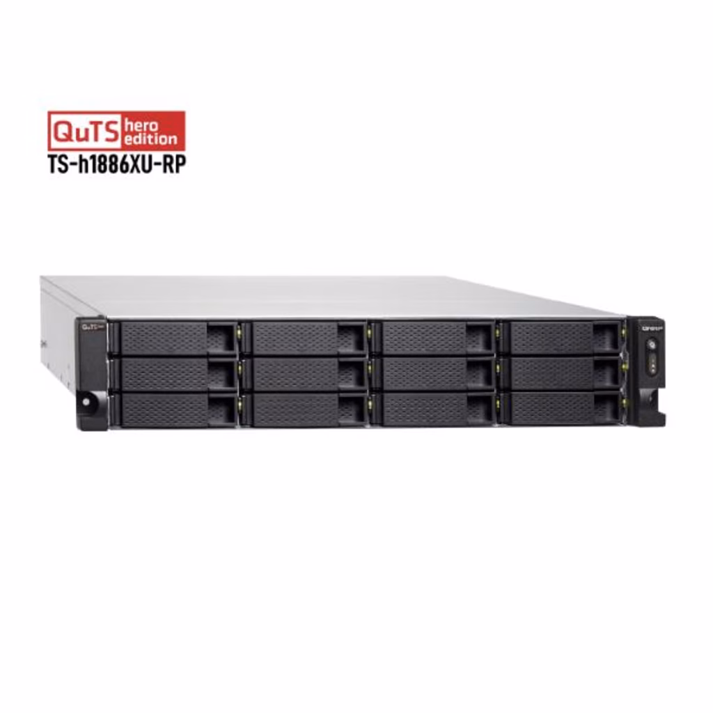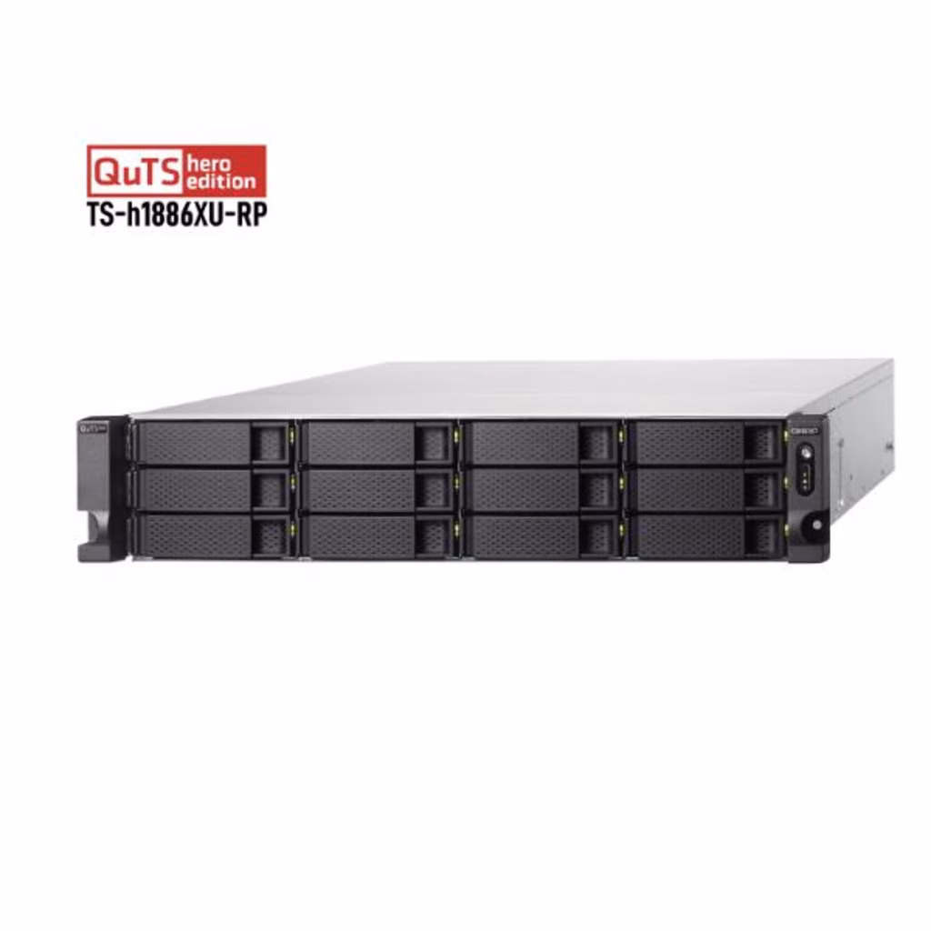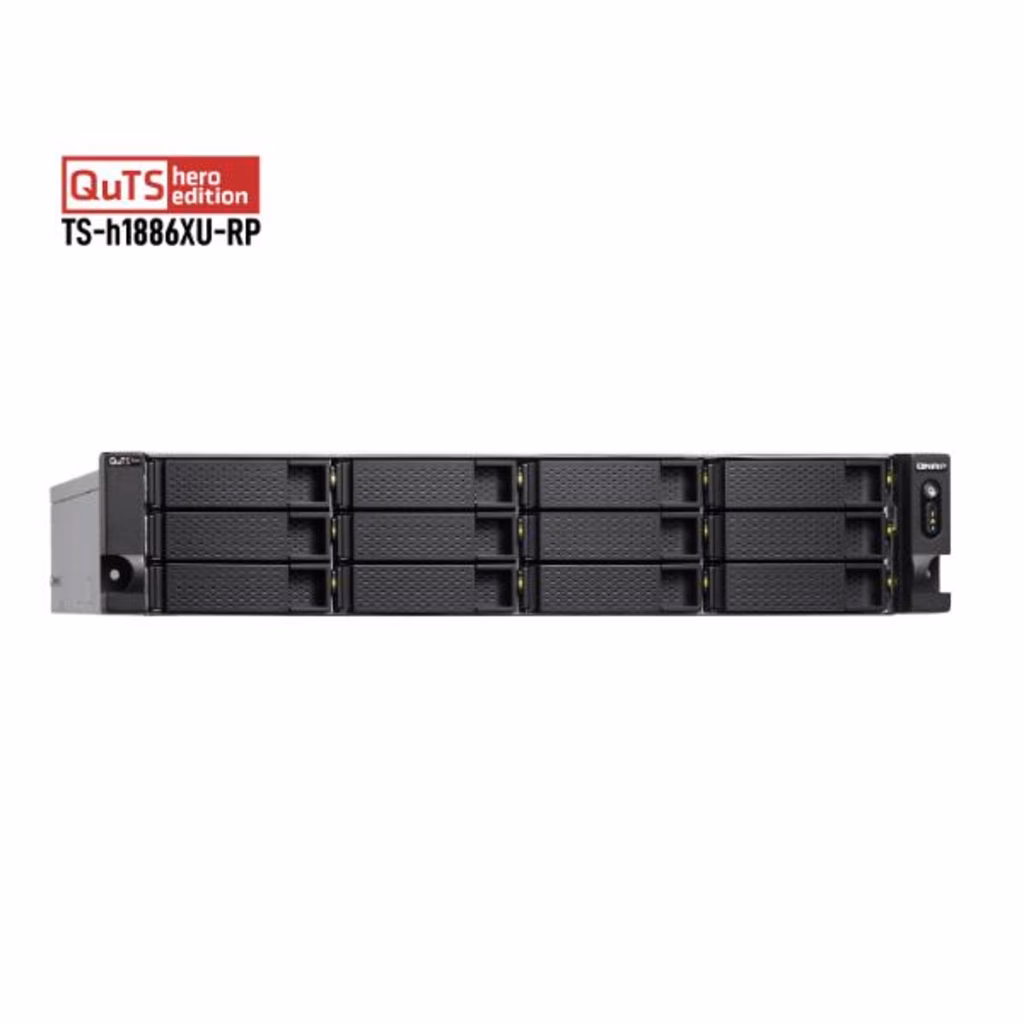 Il TS-h1886XU-RP per montaggio su rack 2U offre dodici slot SATA 6Gb/s da 3,5 , sei slot SSD SATA 6Gb/s da 2,5 , oltre a disporre di un processore Intel® Xeon® D con memoria DDR4 ECC (Codice Error correcting Code) fino a 128 GB per la realizzazione di prestazioni di livello server con elevata affidabilità. La scheda di rete 10GbE SFP+ a due porte pre-installata non solo potenzia le applicazioni a richiesta elevata di banda ma supporta anche RDMA/RoCE per migliorare le prestazioni e ridurre l uso della CPU. Con il sistema operativo QuTS hero basato su ZFS, il TS-h1886XU-RP garantisce l integrità dei dati oltre a supportare la deduplica e compressione interna dei dati a livello di blocco, snapshot quasi illimitate e SnapSync in tempo reale. Sia per i server file importanti, i server di virtualizzazione, l editing video in collaborazione, o applicazioni di backup e recupero efficiente dei dati, il TS-h1886XU-RP offre una soluzione NAS economica a prestazioni elevate.