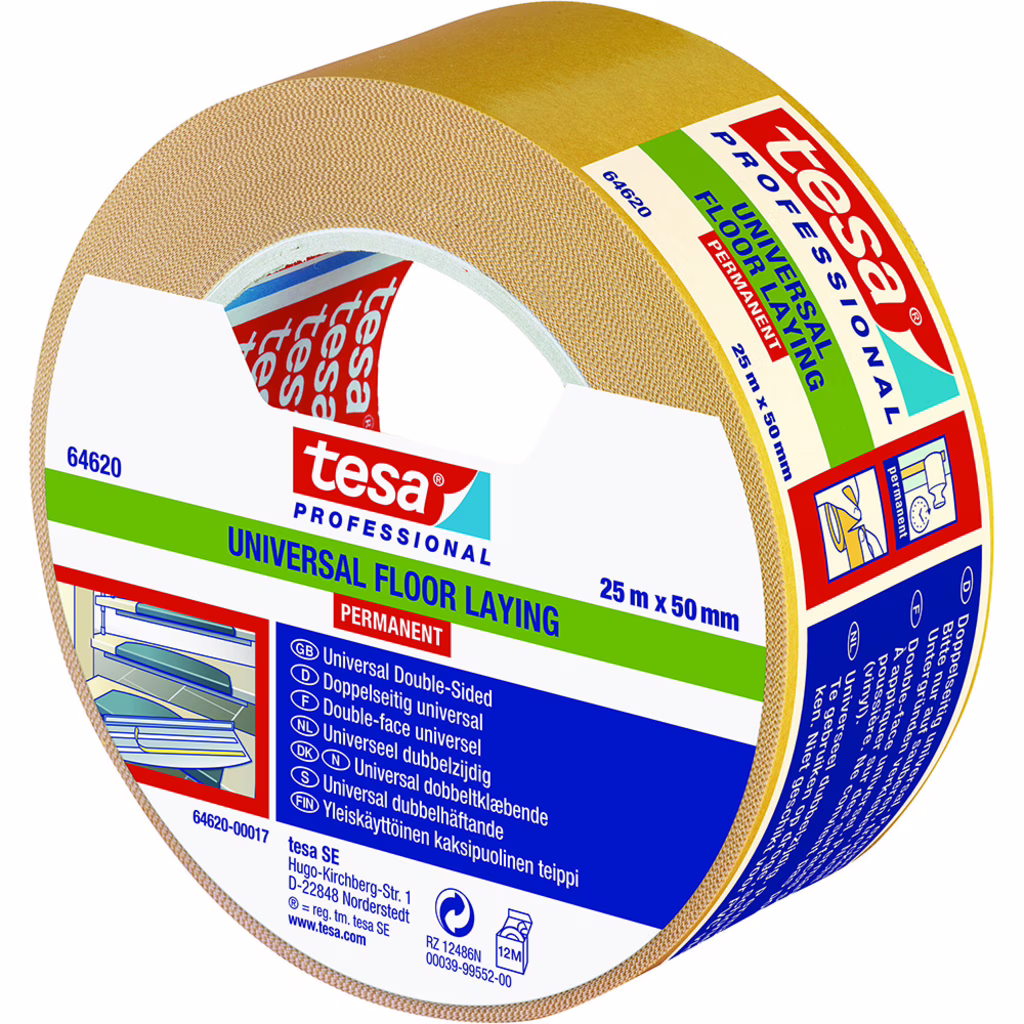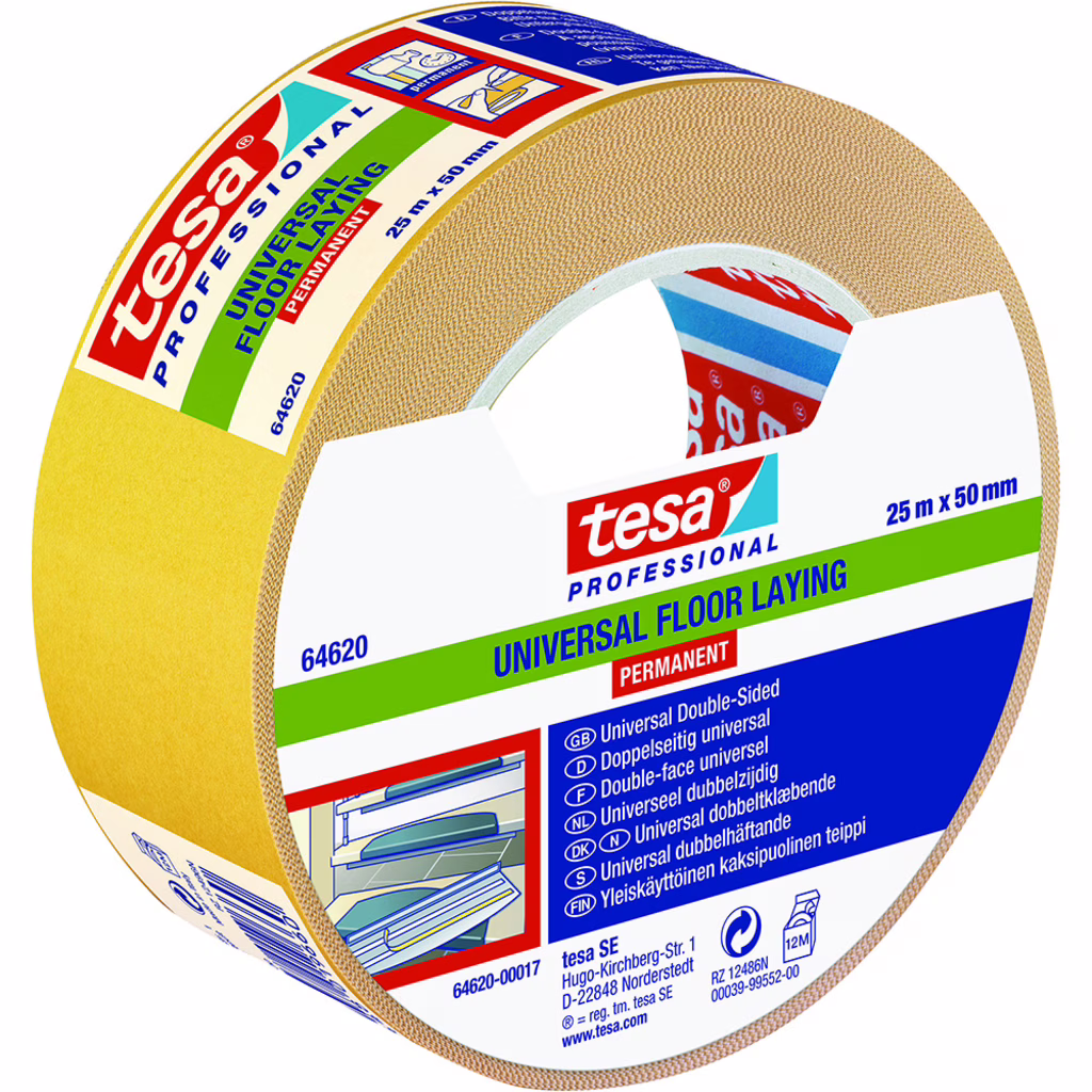 Biadesivo con supporto filmico in polipropilene e adesivo hot-melt in gomma sintetica. Indicato per utilizzo universale per adesivizzare piccole e grandi superfici. Privo di solventi, offre un'elevata adesività iniziale.