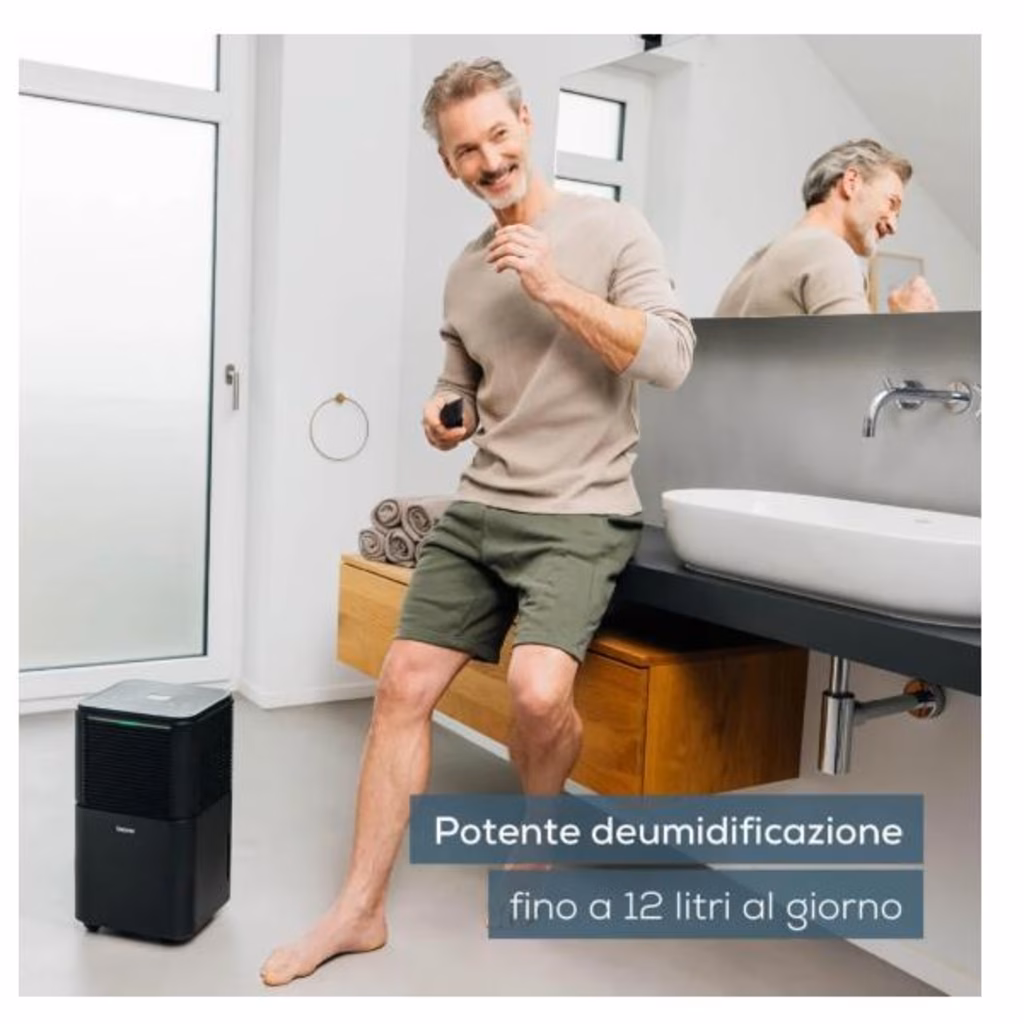 DEUMI LE150Con il deumidificatore LE 150 di Beurer gli odori e la formazione di muffa e condensa in stanze, bagni o cantine appartengono al passato. Rileva l'umidità dell'aria attuale ed è in grado di prelevare dall'aria della stanza fino a 12 litri d'acqua al giorno, a seconda delle esigenze e dell'umidità desiderata impostata. Con la funzione supplementare di asciugatura biancheria è anche possibile stendere il bucato umido appena lavato senza problemi in casa.