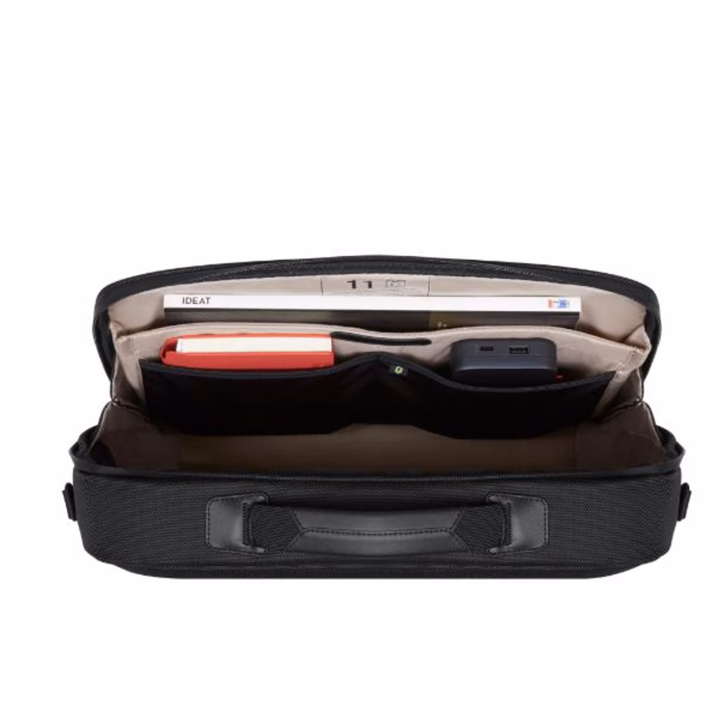 - Lo scomparto principale ospita una postazione di lavoro completa e tasche per riporre accessori e altri piccoli oggetti, tra cui tasca con blocco RFID e portachiavi