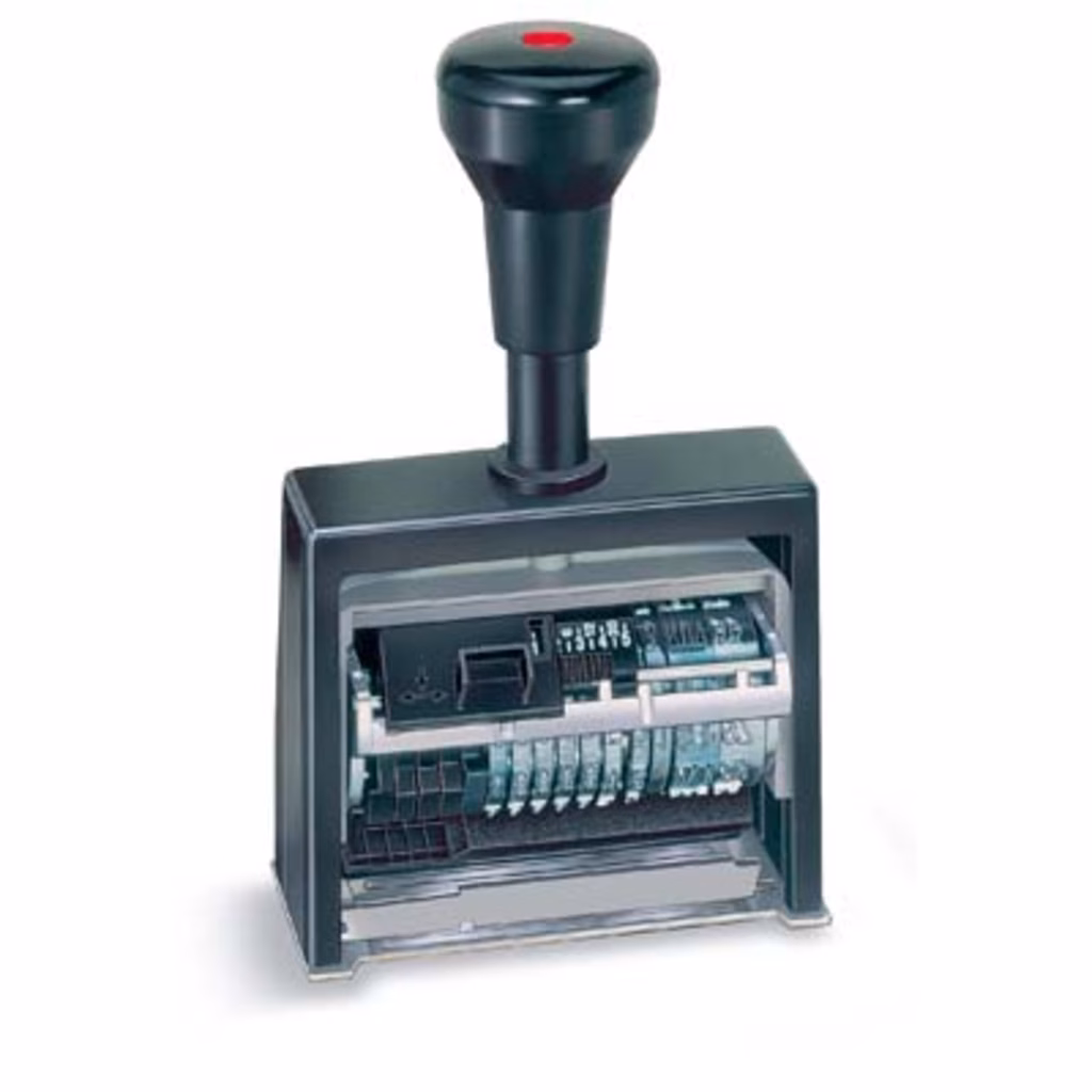 Numeratore/datario automatico senza piastra - ripetizioni 0-1-2-3-4, zeri abbassabili - cavallotto in metallo nichelato - ruote e parti di scatto in acciaio temperato - guide autolubrificanti - cuscinetto preinchiostrato nero