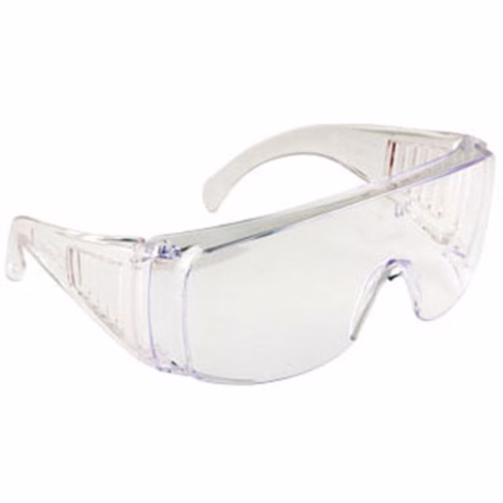 Occhiale monolente per visitatore con montatura e lenti avvolgenti in policarbonato neutro antigraffio.