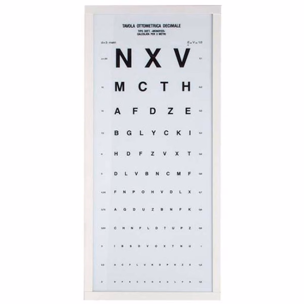 Ottotipo luminoso;illuminazione a luce fluorescente fredda attraverso un diffusore opalino infrangibile in materiale acrilico serigrafato. Utilizzare ad una distanza di 3 m. Costruito secondo le norme C.E.I. 62/5 valide per le apparecchiature elettromedicali.