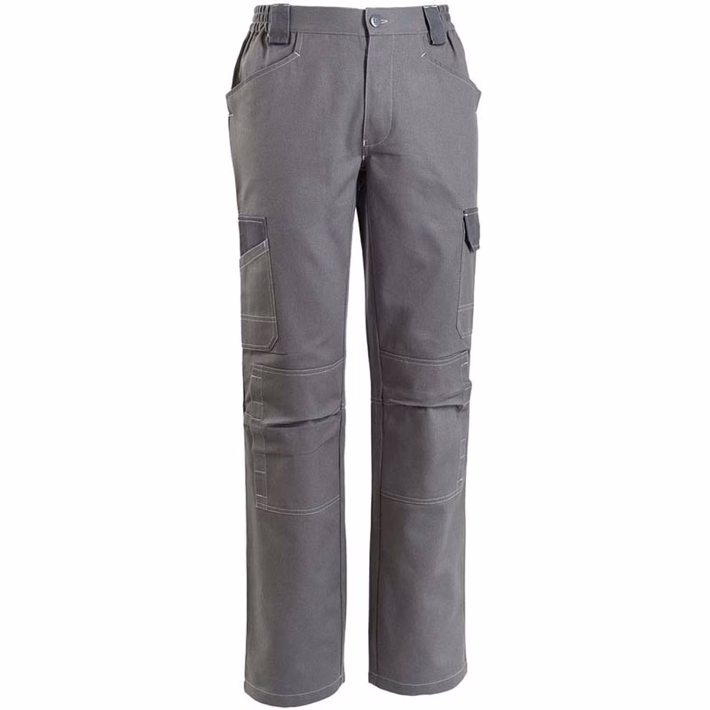 Pantalone lavoro "Globo" con bottoni coperti - elastici laterali in vita - due tasche anteriori - due tasche posteriori con velcro - tascone con pattina su gamba sinistra - doppia tasca applicata su gamba destra - aperture per inserimento protezioni alle ginocchia