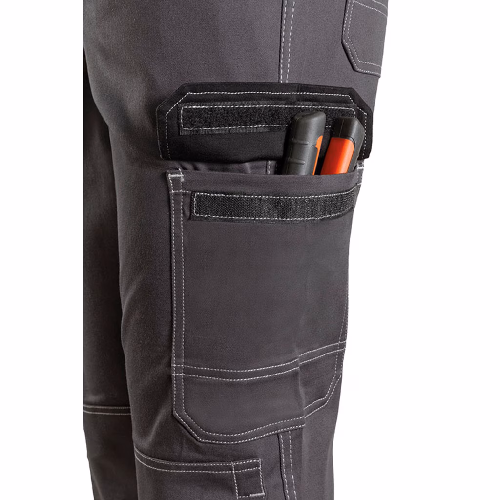 Pantalone lavoro Speedy con bottoni coperti - elastici laterali in vita - due tasche anteriori - due tasche posteriori con velcro - tascone con pattina su gamba sinistra - doppia tasca applicata su gamba destra - aperture per inserimento protezioni alle ginocchia - composizione tessuto: 98% cotone - 2% elastan