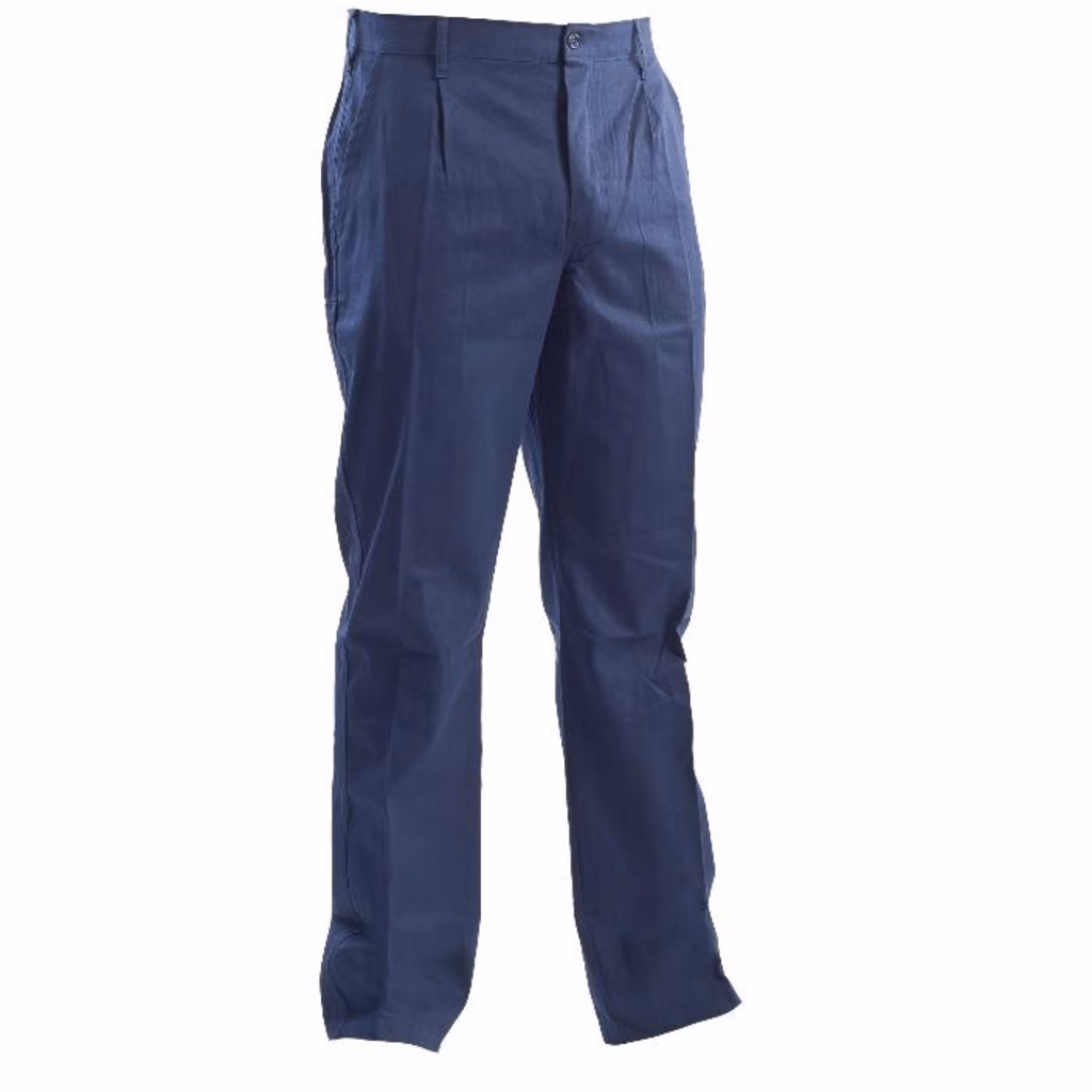 Pantalone da lavoro in cotone drill massaua sanforizzato - chiusura patta con bottoni coperti - due tasche anteriori a filetto - una tasca posteriore applicata chiusa con bottone - tasca portametro - doppie cuciture nei punti di maggior sforzo.