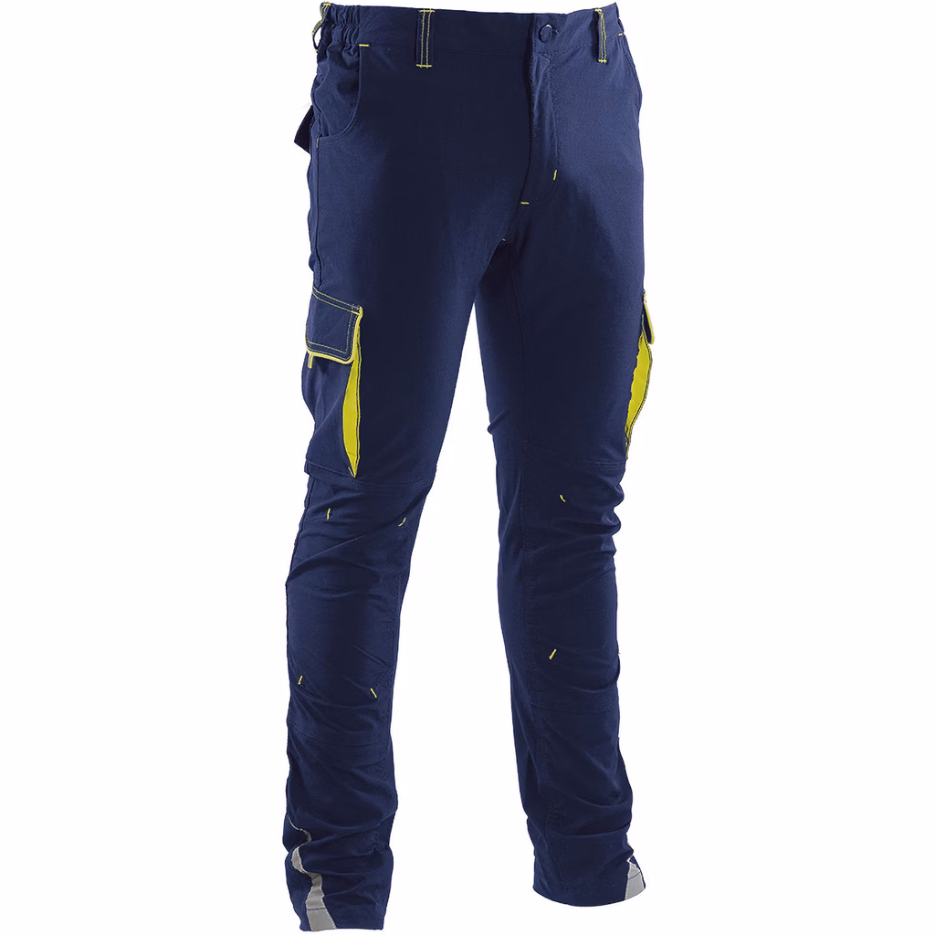 Pantalone in tessuto bielastico 90% nylon 10% spandex con elastico ai fianchi, dettagli rifrangenti sul fondo gamba, ginocchia preformate, chiusura centrale con cerniera e bottone, 2 tasche anteriori applicate, doppio tascone laterale con pattina chiuse con velcro e soffietti, 2 tasche posteriori chiuse con pattina e velcro, tirapattine e doppie cuciture nei punti di maggiore sforzo.