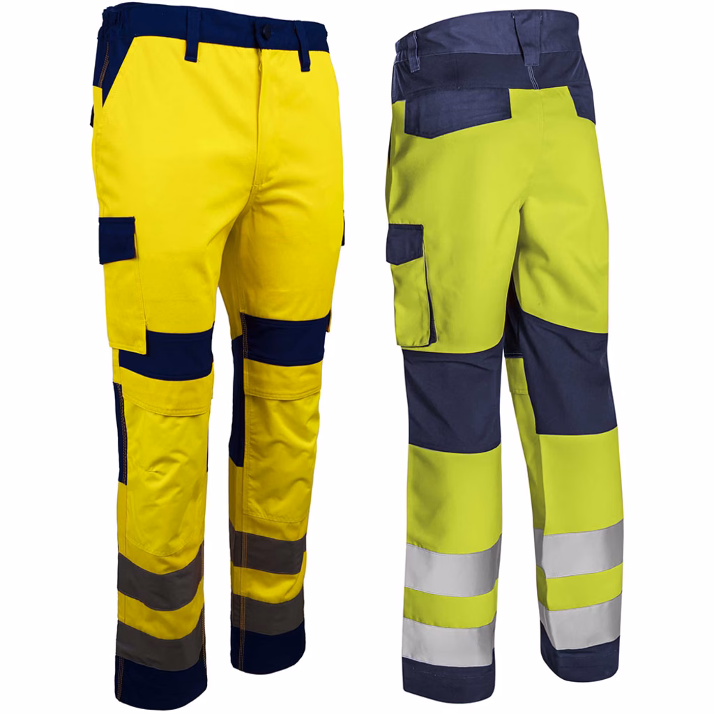 Pantaloni da lavoro ad alta visibilità classe 2, realizzati in tessuto misto twill (60% cotone / 40% poliestere - 270g/m²) con inserti elasticizzati in poliammide ed elastan (90% / 10% - 270g/m²) nelle zone strategiche: sopra e dietro le ginocchia, carrè posteriore e fianchi. Questi inserti garantiscono libertà di movimento e comfort anche durante le attività più dinamiche. La schiena rialzata con fascia stretch migliora laderenza e la protezione lombare. Dotati di 6 tasche funzionali: 2 tasche allitaliana, 2 posteriori con patta e chiusura a strappo, e 2 tasche laterali cargo anch'esse con chiusura a strappo. Le tasche per ginocchiere in Oxford con apertura dallalto offrono protezione secondo la norma EN 14404 tipo 2. Gli orli regolabili (+5 cm) permettono ladattamento in lunghezza. La tripla cucitura lungo le zone principali garantisce robustezza nel tempo. Le bande retroriflettenti cucite da 7 cm con microsfere assicurano visibilità certificata EN ISO 20471 classe 2. Classificati come DPI di Categoria II. Ideale per: edilizia, infrastrutture, lavori pubblici, manutenzione, enti locali e industria leggera.