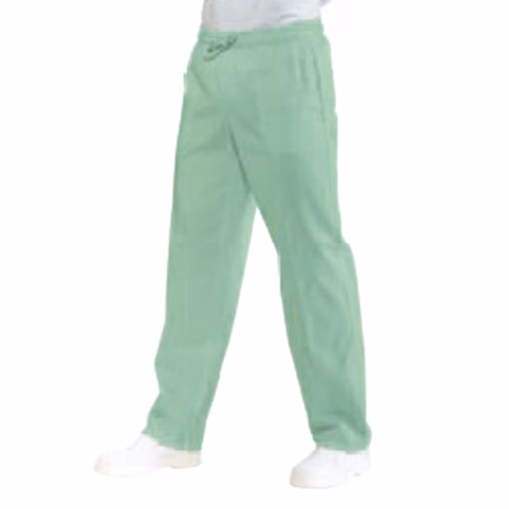 Pantaloni unisex - realizzati in cotone 100% - elastico in vita - chiusura con laccetti in tessuto - 2 tasche anteriori - 1 taschino posteriore - cuciture rinforzate nei punti di maggio sforzo e realizzate in robusto ed idoneo filato - ideali nel campo infermieristico e ospedaliero - tessuto da g/mq 185 - colore verdino - taglia S