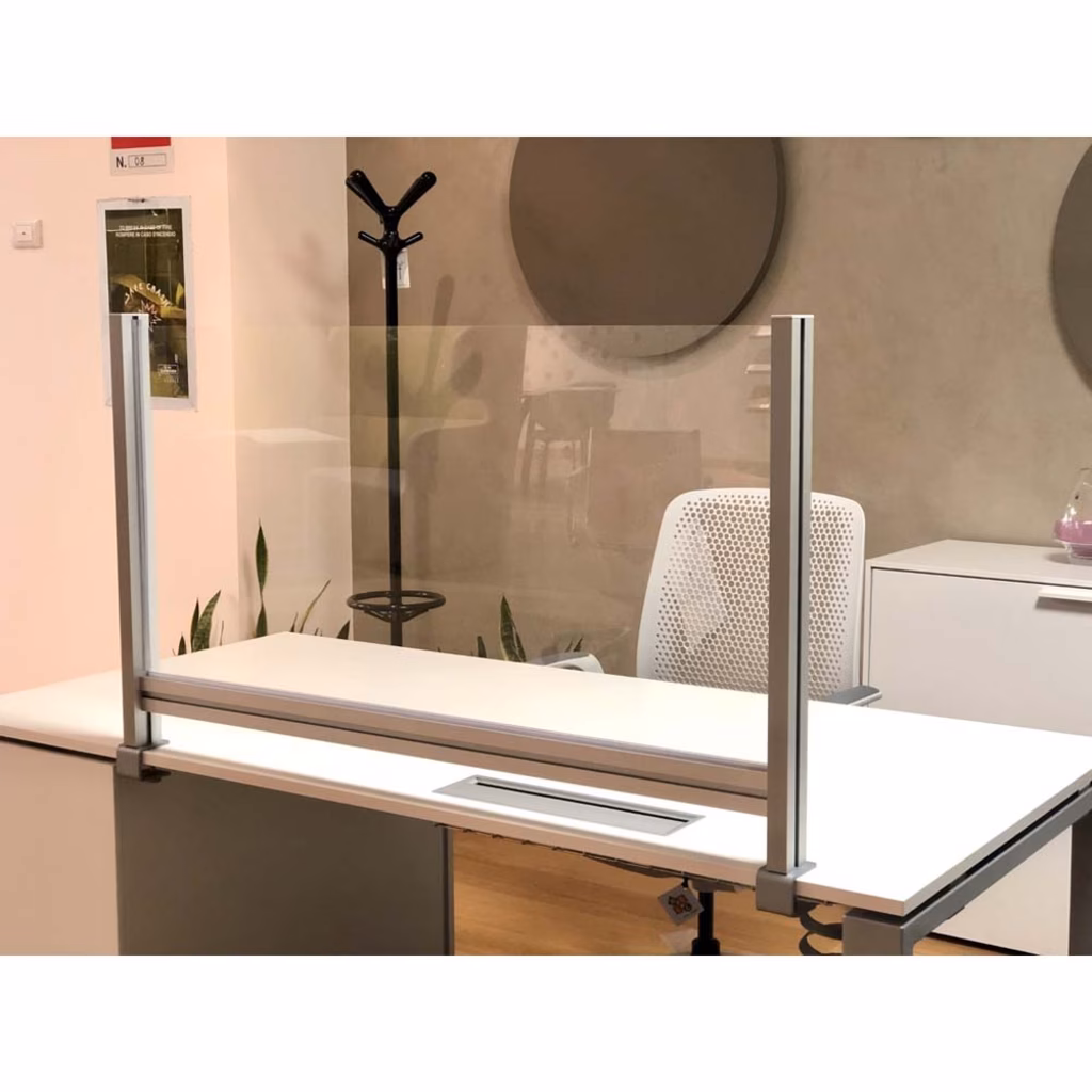 Schermo di protezione realizzato da un telaio in alluminio anodizzato silver, lega EN AW 6060-T5. Il telaio composto da un profilo estruso con sezione 2,5x5 cm, ha un ampia componibilità e può essere richiesto su misura. Pannello in policarbonato trasparente da 3mm, certificato in classe EN 1350-1, ed ha uneccellente resistenza meccanica e agli urti. Versione con traverso inferiore e telaio fissato su scrivania tramite morsetto che accoglie da cm 2 a 3,5. Lo schermo in policarbonato è sollevato per lasciare uno spazio passacarte. Dimensioni schermo in policarbonato: LxH 100x50. Dimensioni paretina: LxH 102x60