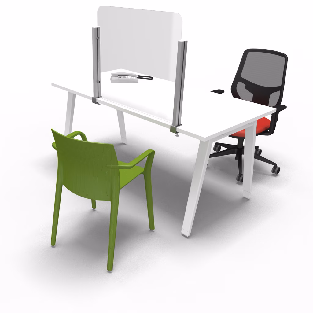 Schermo sagomato in metacrilato spessore 5 mm con filo lucido. Morsetti laterali per fissaggio del pannello. Montanti in alluminio h 50 cm e morsetto di fissaggio su piani da cm 2 a 3.5. Il pannello può essere liberamente posizionato in appoggio al top della scrivania o sollevato per lasciare lo spazio passacarte.