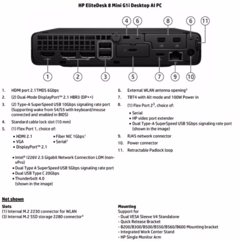 Dotato di prestazioni eccezionali potenziate dall'AI con il più recente processore Intel® Core Ultra e NPU fino a 13 TOPS, il design compatto di HP EliteDesk 8 Mini G1i AI PC lo rende la scelta ideale per gli ambienti di lavoro moderni.