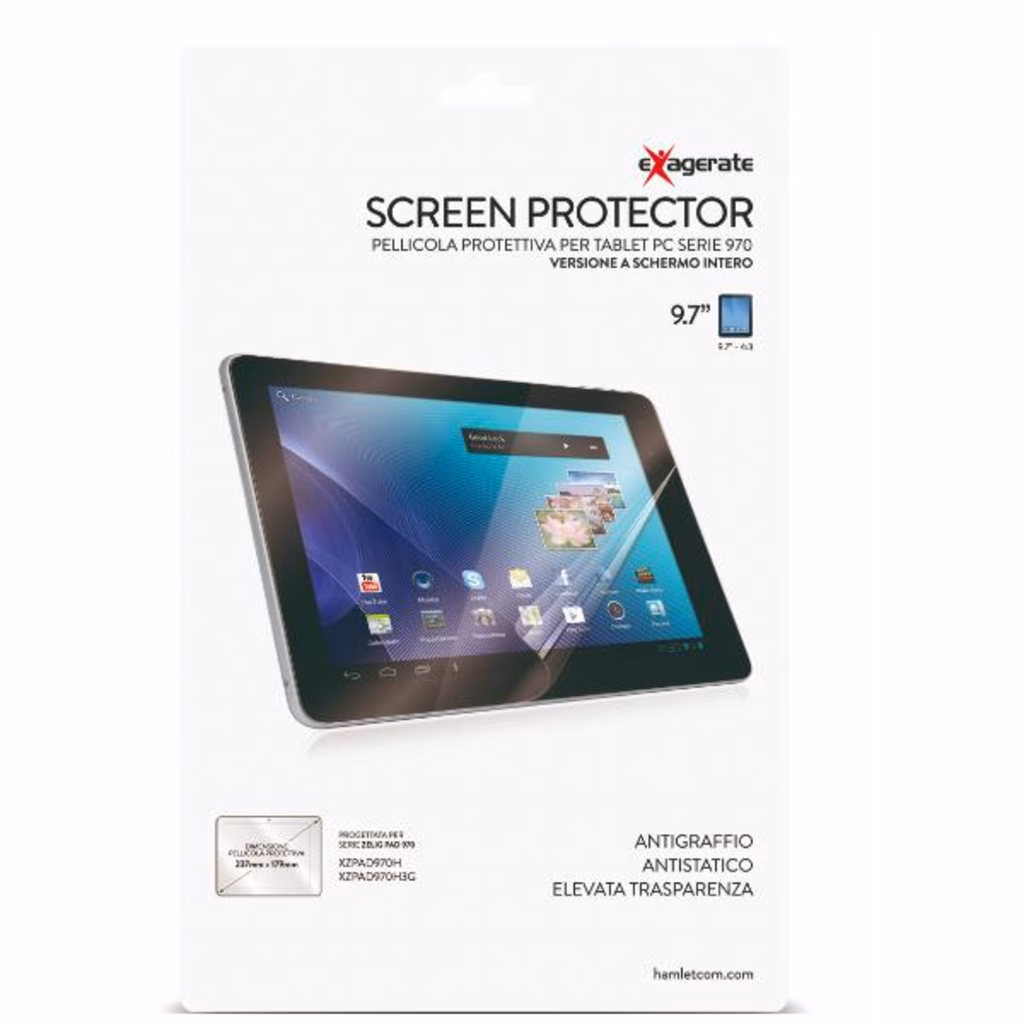 Exagerate Screen Protector è una pellicola protettiva progettata per la protezione dello schermo dei Tablet PC Zelig Pad della serie 970 dotati di schermo 4:3 da 9.7 pollici. Grazie alla sua elevata trasparenza permette di proteggere lo schermo del Tablet da graffi e ditate mantenendo un'ottima qualità di visione.