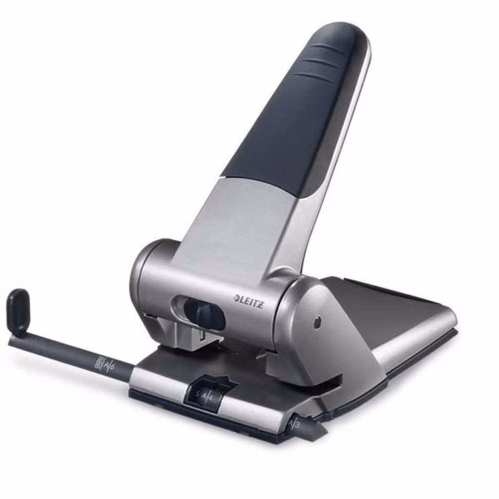 Robusto ed affidabile perforatore a 2 fori per alti spessori con base e maniglia in alluminio pressofuso - la forma ergonomica e gli inserti in gomma soft grip consentono una presa sicura ed uno sforzo di perforazione ridotto - dotato di pulsante per bloccare la leva in posizione abbassata per il minimo ingombro - copertura inferiore in gomma antiscivolo - guida di arresto per l'allineamento della carta con scala graduata e finestra che consente la massima visibilità e la chiara leggibilità dei formati selezionabili (A3, A4, US, A5, A6, 8x8x8) - contenitore sfridi brevettato