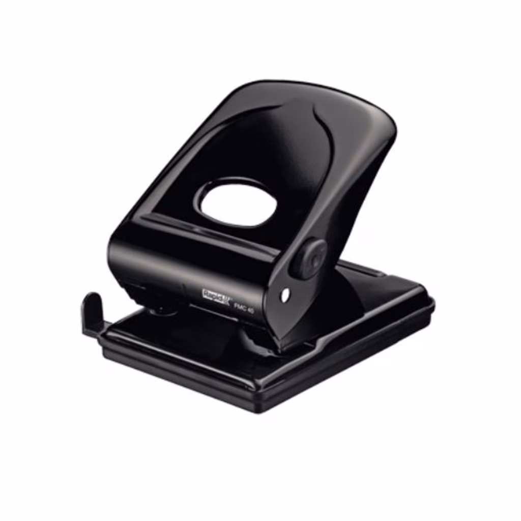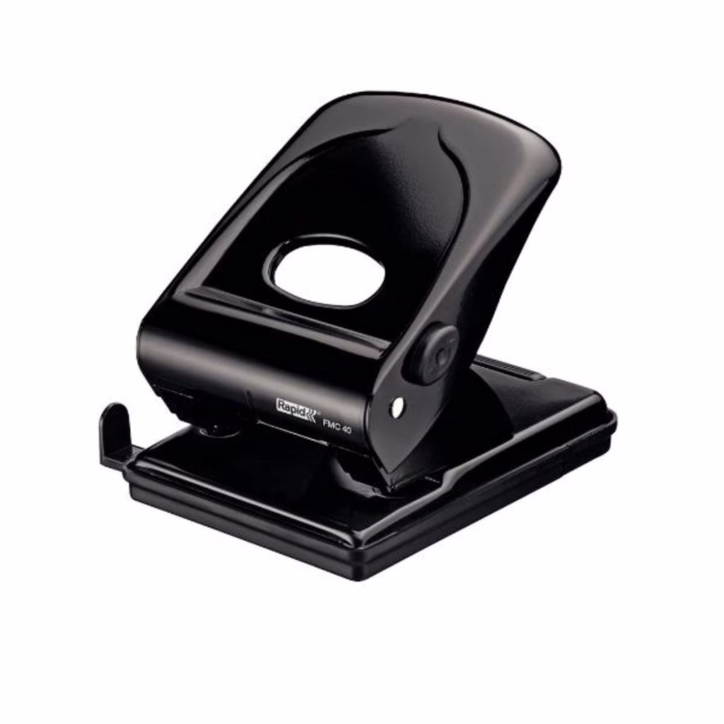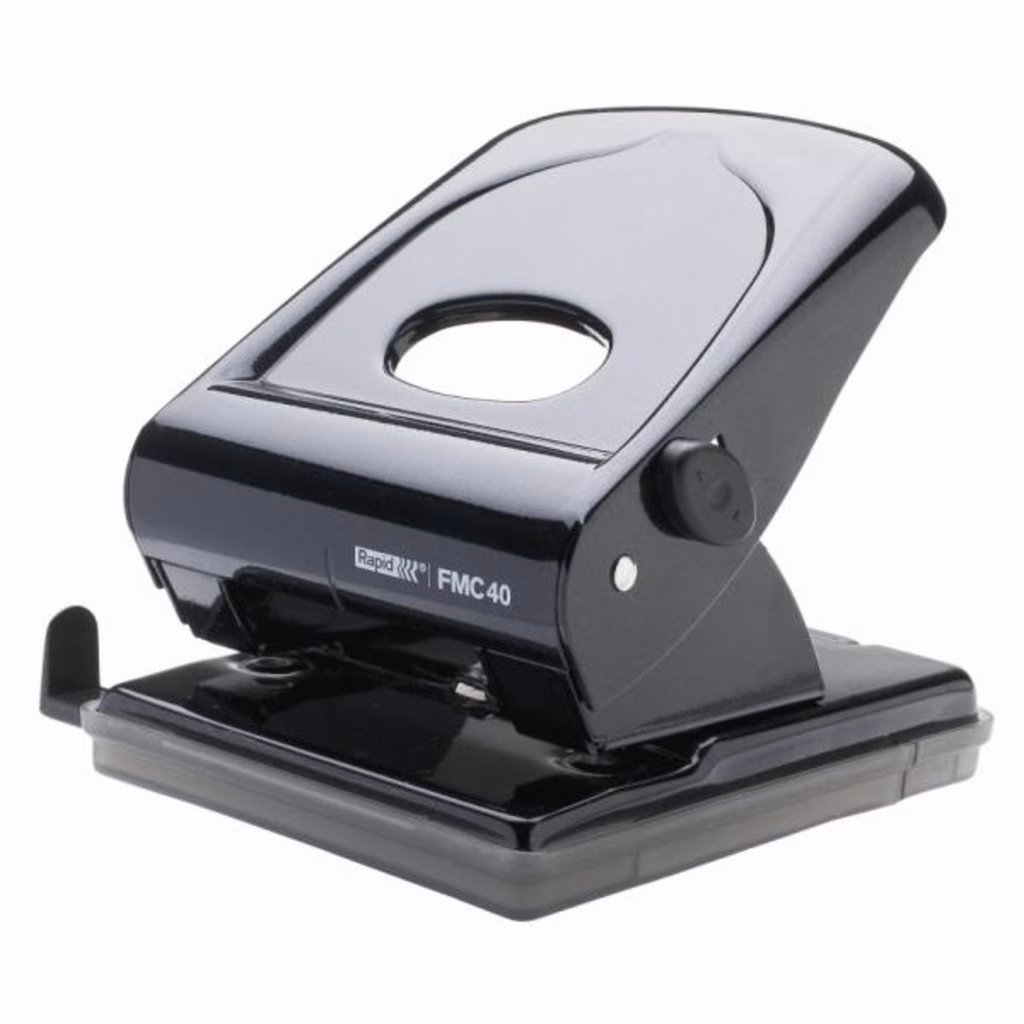 Ottimo perforatorein  metallo per la casa e l'ufficio, perfora fino a 40 fogli. Ampio contenitore per i coriandoli. Blocco dell'impugnatura per essere riposto senza problemi. Guida allineamento carta. Design coordinato con le cucitrici Rapid FM.