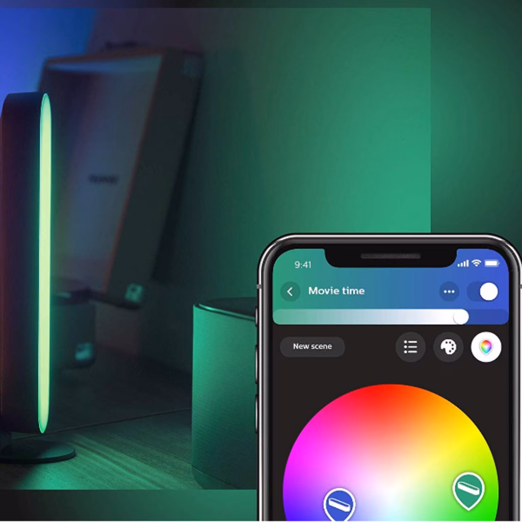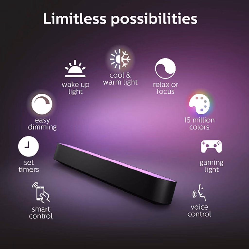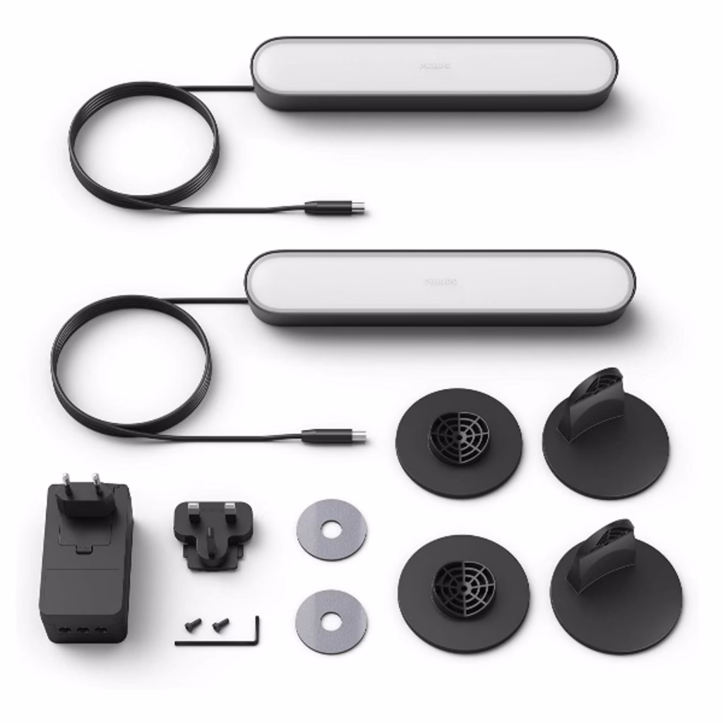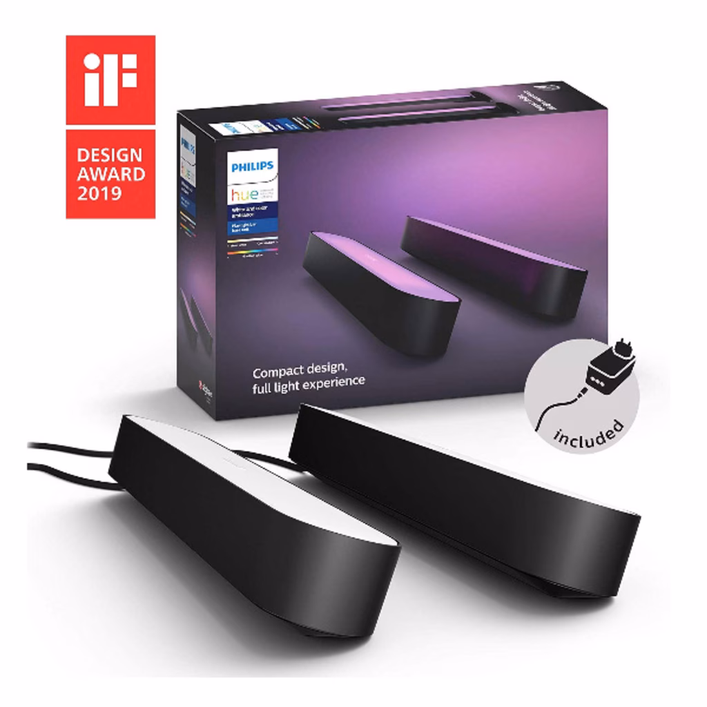 Hue Play Unità Base con alimentatore 2 pezzi NeroControlla le luci con la tua voce*Controlla le tue luci solo con la tua voce, senza usare le mani! I comandi vocali ti consentono di controllare più luci in una stanza contemporaneamente o solo una lampada. *Funziona con Assistente Google e Amazon Alexa.Crea l'atmosfera giusta con luce bianca tenueLe lampadine e le lampade Hue utilizzano una luce bianca tenue. L'intensità regolabile delle luci, da brillante a bassa per la notte, ti consente di colorare casa tua con la giusta tonalità di luce calda quando ti serve.