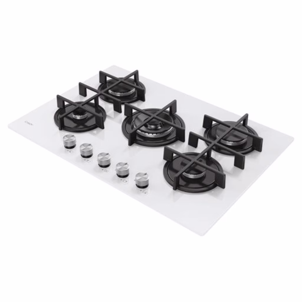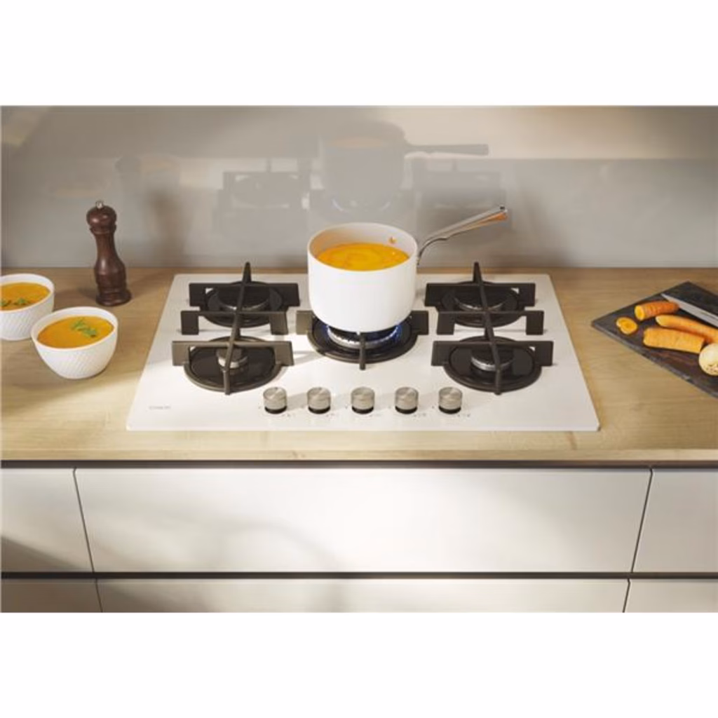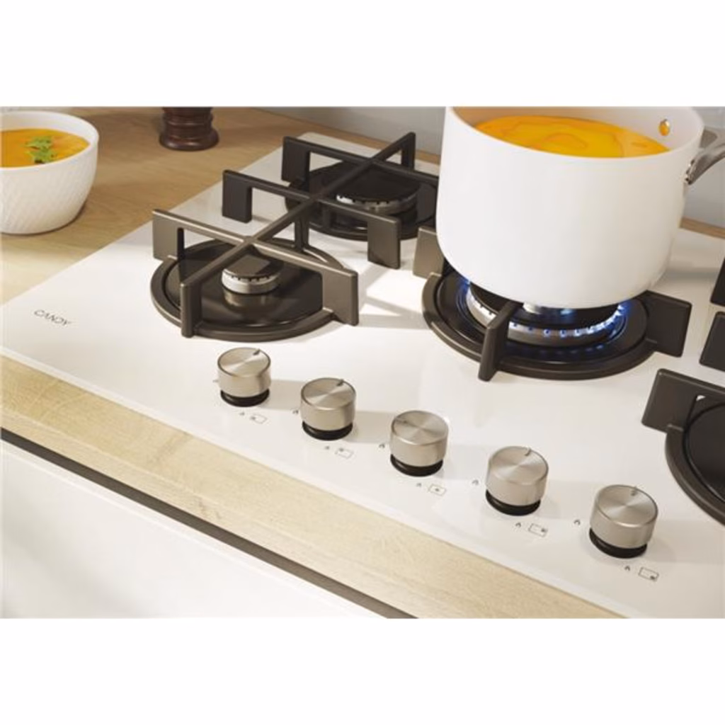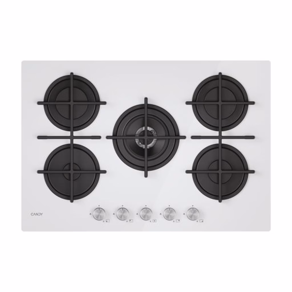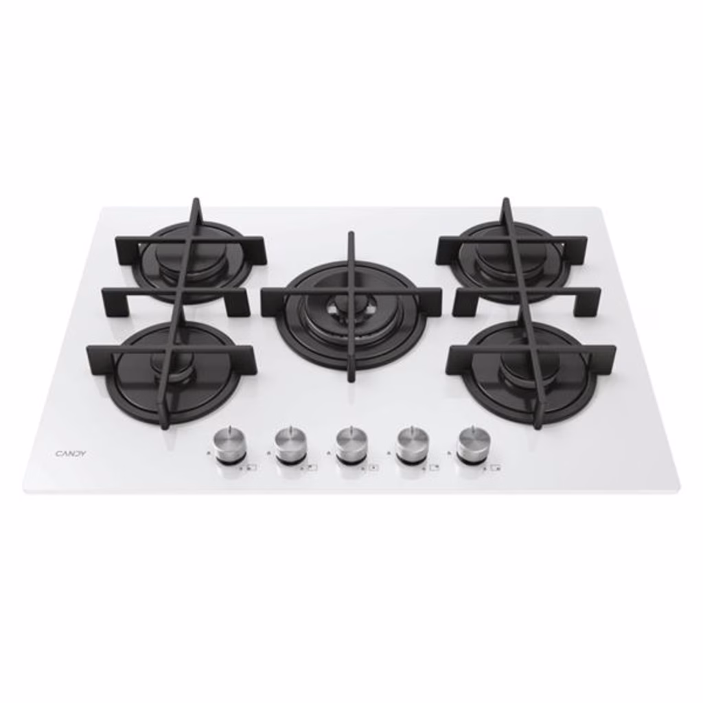 Candy Moderna CVG74WTW Bianco Da incasso 74.5 cm Gas 5 Fornello(i)Moderna Gas on Glass I piani cottura Moderna Gas on Glass sono pensati per chi ama il design moderno e innovativo in grado di abbinarsi ad ogni stile. Il piano cottura a gas su vetro offre un tocco di eleganza combinato ad una grande durata e prestazioni di alto livello. Il vetro temperato resiste ai graffi e alle abrasioni rendendo questo prodotto incredibilmente durevole nel tempo.Cottura efficiente e precisaPuò raggiungere una potenza fino a 4 KW garantendo una maggiore efficienza rispetto ai fornelli tradizionali. Particolarmente adatto per le padelle di larghe dimensioni, permette di cucinare con precisione tutti i tipi di pietanze.Trasmissione ottimale del caloreLa ghisa è un materiale molto apprezzato perché garantisce una migliore trasmissione del calore, un'ottima resistenza anche alle temperature più elevate e una lunga durata nel tempo. Una cucina professionale, a casa tua.Basta lavare a mano le griglie!Non perdere tempo a lavare a mano le griglie del tuo piano cottura! Tutte le nostre griglie sono lavabili in lavastoviglie, consigliamo una temperatura di lavaggio tra i 70° e i 75° per mantenere le tue griglie come nuove.Riduci i rischi di rotturaIl vetro temperato è elegante e robusto e riduce al minimo il rischio di rottura.