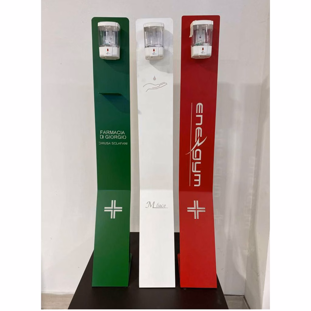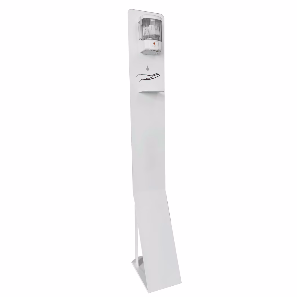 Piantana in metallo bianco con dispenser a fotocellula per sapone liquido e gel